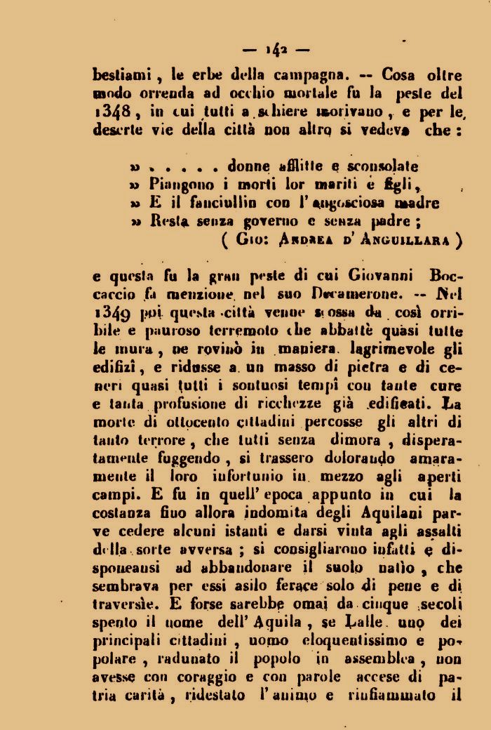 e questa fu la grau peste di cui Giovanni Boccaccio .fa menzione nel suo Decamerone. — Mei 1349 poi questa «città venne scossa da così orribile e pauroso terremoto che abbattè quasi tutte le mura, ne rovinò iu maniera, lagrimevole gli edifizi, e ridusse a. un masso di pietra e di ceneri quasi tutti i sontuosi tempi cou tante cure e tanta profusione di ricchezze già .edificati. La morte di ottocento cittadini percosse gii altri di tanto terrore , che tutti senza dimora , dispera-tatuatile fuggendo , si trassero dolorando amaramente il loro infortunio in mezzo agli aperti campi. E fu in queli' epoca appunto in cui la costanza Quo allora indomita degli Aquilani parve cedere alcuni istanti e darsi vinta agli assalti ddla sorte avversa ; si consigliarono infitti e di* spoueausi ad abbandonare il suolo natio , che sembrava per essi asilo ferace solo di pene e di traversìe. E forse sarebbe ornai da cinque secoli spento il nome dell'Aquila, se Laile uno dei principali cittadini , uomo eloquentissimo e pò-* polare , radunato il popolo in assemblea , non avesse con coraggio e con parole accese di patria carità, ridestato V animo e rinfiammato il