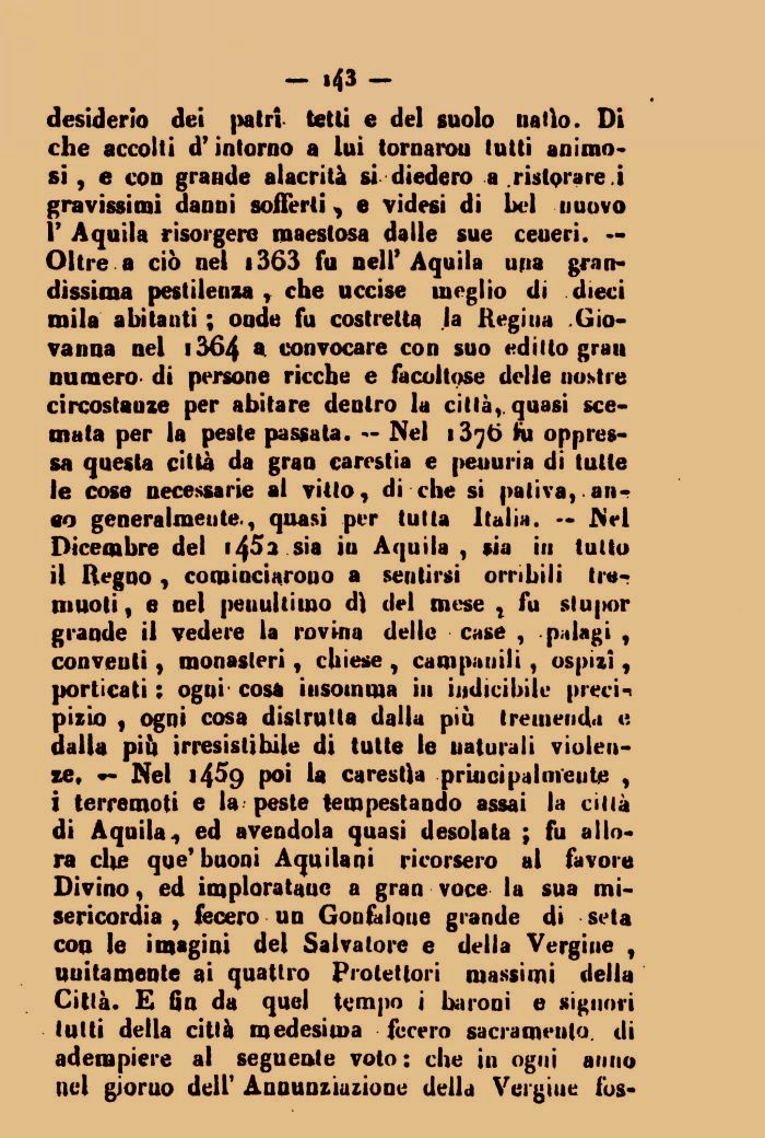 desiderio dei patri ietti e del suolo natio. Di che accolti d'intorno a lui tornarou tutti animosi 9 e con grande alacrità si diedero a .ristorare.i gravissimi danni sofferti ^ e videsi di bel nuovo 1' Aquila risorgere maestosa dalle sue ceneri. — Oltre a ciò nel i363 fu nell'Aquila una grandissima pestilenza , che uccise meglio di dieci mila abitanti ; onde fu costretta la Regiua Giovanna nel i364 * convocare con suo editto gran numero di persone ricche e facoltose delle nostre circostanze per abitare dentro la città,, quasi scemata per la peste passata. — Nel 1376 hi oppressa questa città da gran carestia e penuria di tutte le cose necessarie al vitto, di che si pativa, alleo generalmente., quasi per tutta Italia. — Nel Dicembre del 1453 sia in Aquila , sia in tutto il Reguo , cominciarono a sentirsi orribili tre-? (nuoti, e nel penultimo d\ del mese r fu stupor grande il vedere la rovina delie case , palagi , conveuti, monasteri, chiese , campanili , ospizi, porticati ; ogni cosa insomma iu indicibile preci-* pizie , ogni cosa distrutta dalla più tremenda e dalla più irresistibile di tutte le uaturali violenze» Nel 14^9 P°i hi carestìa principalmente , i terremoti e la peste tempestando assai la città di Aquilaed avendola quasi desolata ; fu allora clie que' buoni Aquilani ricorsero al favore Divino, ed imploratane a gran voce la sua misericordia , fecero un Gonfalone grande di seta eoa le imagini del Salvatore e della Vergine , unitamente ai quattro Protettori massimi della Città. £ (in da quel tempo i baroni e signori tutti della città medesima fecero sacramento, di adempiere al seguente voto : che in ogni anno nel gioruo dell1 Annunziamone della Vergiue fos-