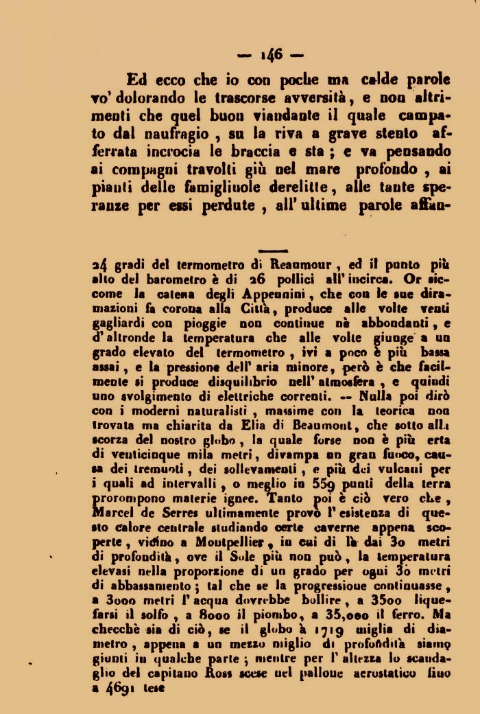 a4 gradi del termometro di Reaumour , ed il putito più allo del barometro è di 26 pollici air incirca. Or siccome la catena degli Appennini, che con le tue diramazioni fa corona alla Citta, produce alle volte venti gagliardi con pioggie non continue ne abbondanti, e d'altronde la temperatura che alle volte giunge a un grado elevato del termometro , ivi a poco è più bassa assai, e la pressione dell' aria minore, però è che facilmente si produce disquilibrio nell' atmosfera , e quindi uno svolgimento di elettriche correnti. — Nulla poi dirò con i moderni naturalisti , massime con la teorica noa trovata ma chiarita da Elia di Beaumont, che sotto alli scorza del nostro globo , la quale forse non è più erta di venticinque mila metri, divampa on gran fuoco, cauta dei tremuoti, dei sollevamenti , e più dui vulcani per i quali ad intervalli , o meglio in 559 Punl' della terra prorompono materie ignee. Tanto noi è ciò vero che , Marcel de Serres ultimamente provo V esistenza di questo calore centrale studiando certe caverne appena scoperte , virino a Montpellier 9 in cui di Ifc dai 3o metri di profoudith, ove il Sole più non può, la temperatura elevasi nella proporzione di un grado per ogni 3ò metri di abbassamento ; tal che se la progressioue continuasse , a 3ooo metri 1' acqua dovrebbe bollire , a 35oo liquefarsi il solfo , a 8000 il piombo, a 35,000 il ferro. Ma checche sia di ciò, se il globo k 1719 miglia di diametro , appena a un mezzo miglio di profondila sia 1119 giunti iu qualche parte ; mentre per V altezza lo scandaglio del capitaiio Ross scese nel palloue aerostatico iiuo a 4%1 te**