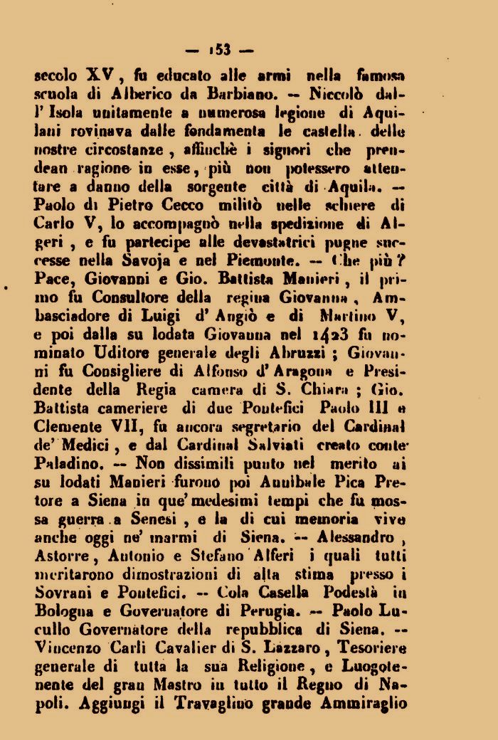 secolo XV , fu educato alle armi nella famosa scuola di A iberico da Barbiano. — Niccolò dall' Isola unitamente a numerosa legione di Aquilani rovinava dalle fondamenta le castella, delle nostre circostanze , affinchè i signori che pren-dean ragione in esse, piò non potessero attentare a danno della sorgeute citta di Aquila, — Paolo di Pietro Cecco militò nelle schiere di Carlo V, lo accompagnò nella spedizione di Algeri , e fu partecipe alle devastatrici pugne successe nella Savoja e nel Piemonte. — < !he più ? Pace, Giovanni e Gio. Battista Manieri , il primo fu Consultore della regiua Giovanna , Am-basciadore di Luigi d' Arigiò e di Martino V, e poi dalla su lodata Giovanna nel i4*3 fu nominato Uditore generale degli Abruzzi ; Giovanni fu Consigliere di Alfonso d'Aragona e Presidente della Regia camera di S. Chiara ; Gio. Battista cameriere di due Pontefici Paolo 111 h Clemente VII, fu ancora segretario del Cardinal de' Medici , e dal Cardinal Salviati creato conte* Paladino. — Non dissimili punto nel merito ai su lodati Manieri furouo poi Annibale Pica Pretore a Siena in que'medesimi tempi che fu mossa guerra .a Senesi , e la di cui memoria vive anche oggi ne' inarmi di Siena, -- Alessandro , Astorre, Antonio e Stefano AIferi i quali tutti meritarono dimostrazioni di alta stima presso i Sovrani e Poutelici. — Cola Casella Podestà in Bologna e Governatore di Perugia. — Paolo Lu-cullo Governatore della repubblica di Siena. — Vincenzo Carli Cavalier di S. Lazzaro, Tesoriere generale di tutta la sua Religione , e Luogotenente del gran Mastro iti tutto il Reguo di Napoli. Aggiungi il Travaglino grande Ammiraglio
