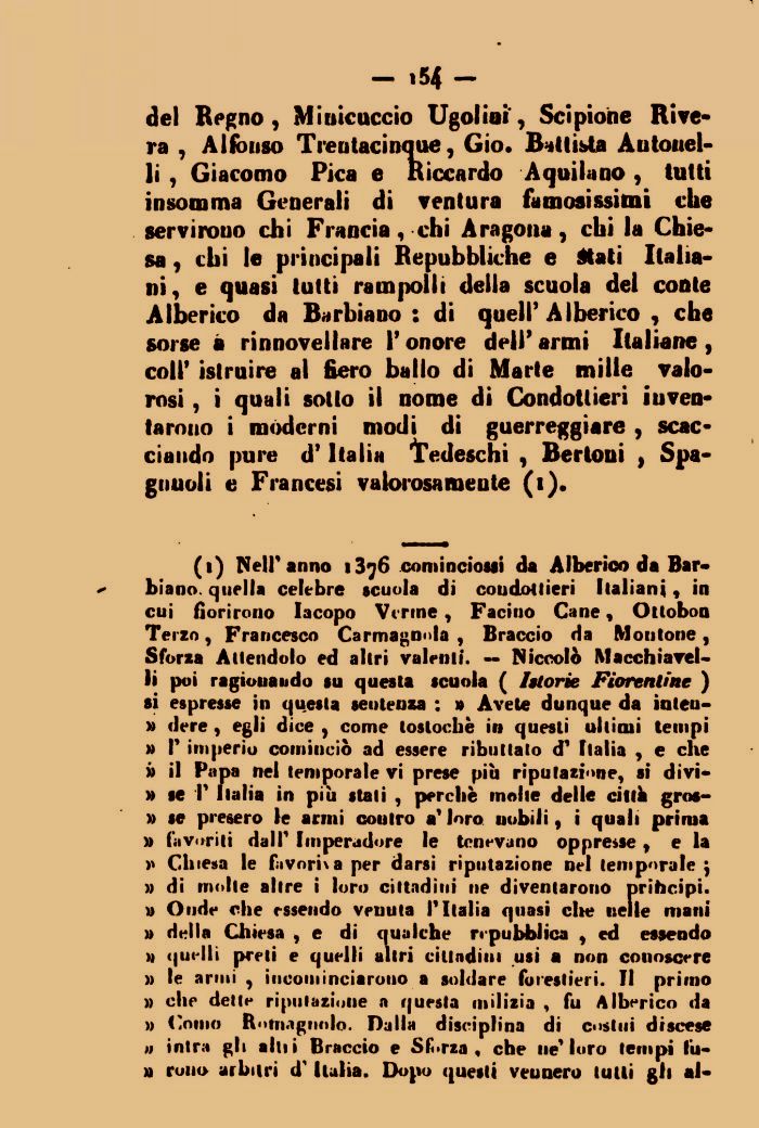 del Regno, Minicuccio Ugolini, Scipione Rivela , Alfonso Trentacinque, Gio. Battista Antonel-li , Giacomo Pica e Riccardo Aquilano, lutti insomma Generali di ventura famosissimi che servirono chi Francia, chi Aragona, chi la Chiesa , chi le principali Repubbliche e Mali Italiani, e quasi tutti rampolli della scuola del conte Alberico da Barbiano : di quell'Alberico , che sorse a rinnovellare l'onore dell' armi Italiane, coli' istruire al fiero ballo di Marte mille valorosi , i quali sotto il nome di Condottieri iuven* tarono i moderni modi di guerreggiare , scacciando pure d'Italia tedeschi , Bertoni , Spaglinoli e Francesi valorosamente (i).