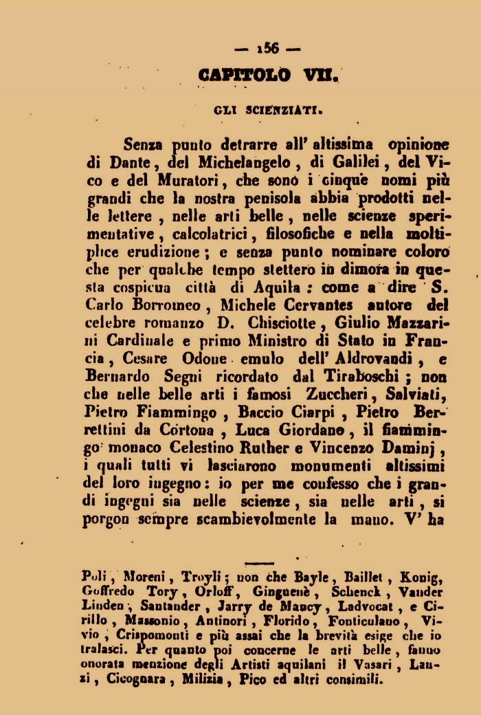 Senza punto detrarre all' altissima opinione di Dante , del Michelangelo , di Galilei, del Vico e del Muratori, che sonò i cinque nomi pih grandi che la nostra penisola abbia prodotti nelle lettere , nelle arti belle , nelle scienze spert-meutative , calcolatrici, filosofiche e nella molti-plice erudizione ; e senza punto nominare coloro che per qualche tempo stetterò in dimora in questa cospicua città di Aquila ; come a dire S. Cario Borromeo , Michele Cervantes autore del celebre romanzo D. Chisciotte, Giulio Mazzari-ni Cardinale e primo Ministro di Stato in Francia , Cesare Odone emulo dell' Aldrovandi , e Bernardo Segni ricordato dal Tiraboscbi ; non che nelle belle arti i famosi Zuccheri, Sai via ti, Pietro Fiammingo , Baccio Ciarpi , Pietro Berrettini da Cortona , Luca Giordane, il fiammingo monaco Celestino Ruther e Vincenzo Daminj, i quali tutti vi lasciarono monumenti altissimi del loro iugegno : io per me coufesso che i grandi ingegni sia nelle scienze , sia uelle arti , si porgon sempre scambievolmente la mauo. V' ha
