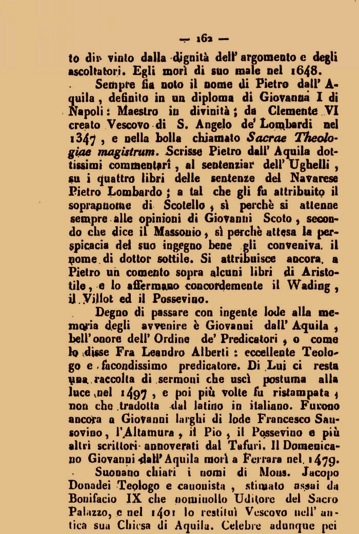 Settipre fia noto il nome di Pietro dall' A-quila , definito in un diploma di Giovanna I di Napoli : Maestro in divinità ; da Clemente VI creato Vescovo di S. Angelo de' Lombardi nel i347 ) e nella bolla chiamato Sacrae Theolo-giae magistrum. Scrisse Pietro dall' Aquila dottissimi commentari, al sentenziar dell' Ughelli , su i quattro libri delle sentenze del bavarese Pietro Lombardo } a tal che gli fu attribuito il soprannome di Scotello * sì perchè si attenne sempre alle opinioni di Giovanni Scoto * secondo che dice il Massonio * sì perchè attesa la perspicacia del suo ingegno bene gli conveniva, il gome di dottor sottile. Si attribuisce ancora, a Pietro uh comento sopra alcuni libri di Aristotile , e lo affermano concordemente il Wading , ij yillot ed il Posseviuo.