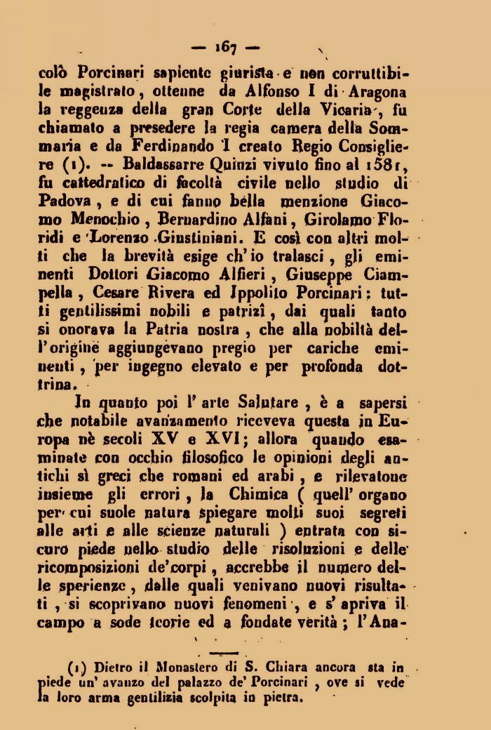 colò Porcinari sapiente giurista e non corruttibile magistrato, ottenne da Alfonso I di Aragona la reggenza della gran Corte della Vicaria, fu chiamato a presedere la regia camera della Sommaria e da Ferdinando I creato Regio Consiglie* re (1). — Baldassarre Quinzi vivuto fino al i58r, fu cattedratico di fccoltà civile nello studio di Padova , e di cui fanno bèlla menzione Giacomo Menochio , Bernardino Alfa ni, Girolamo Floridi e 'Lorenzo .Giustiniani. E così con altri molti che la brevità esige eh' io tralasci , gli eminenti Dottori Giacomo Alfieri , Giuseppe Cìam-pella , Cesare Ri vera ed Ippolito Porcinari : tutti gentilissimi nobili e patrizi, dai quali tanto si onorava la Patria nostra , che alla nobiltà dell'origine aggiungevano pregio per cariche eminenti , per ingegno elevato e per profonda dottrina.