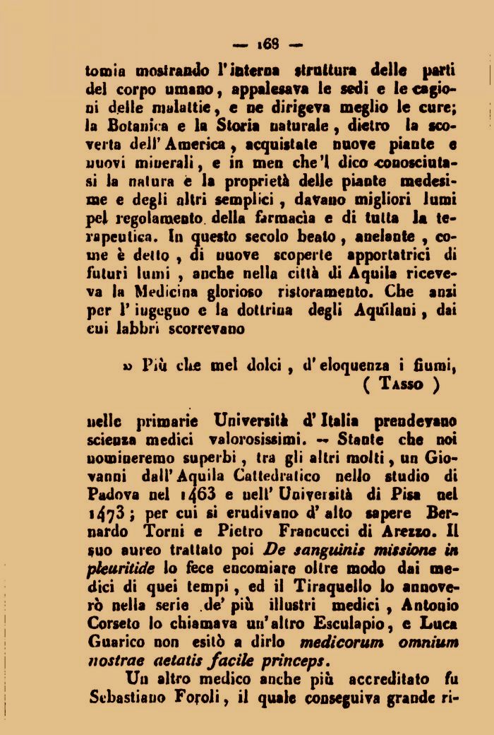 nelle primarie Università d'Italia prendevano scienza medici valorosissimi. — Stante che noi nomineremo superbi, tra gli altri molti, un Giovanni dall'Aquila Cattedratico nello studio di Padova nel i463 e nell' Università di Pisa nel i473 ; per cui si erudivano d'alto sapere Bernardo Torni e Pietro Francucci di Arezzo. Il «no aureo trattato poi De sanguinis missione in pleuritide lo fece encomiare oltre modo dai medici di quei tempi, ed il Tiraquello lo annoverò nella serie de' più illustri medici , Antonio Corseto lo chiamava un' altro Esculapio, e Luca Guarico non esitò a dirlo medicorum omnium nostrae aetatis facile princeps.