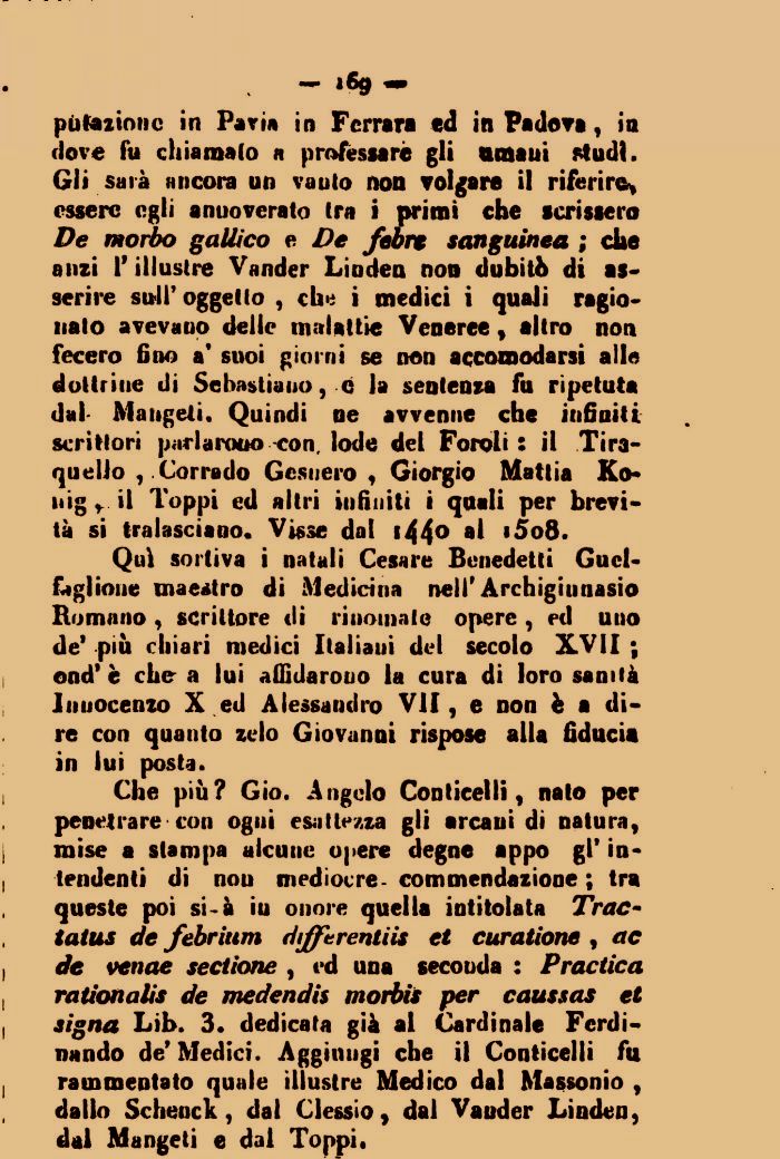 Che più? Gio. Angelo Conticeli!, nato per penetrare con ogni esattezza gli arcani di natura, mise a stampa alcune opere degne appo gì' in* tendenti di nou mediocre- commendazione ; tra queste poi sUà iu onore quella intitolata Trac-tatus de febrium differentiis et curatione , ac de venae sectione , ed una seconda : Practica ratìonalis de medendis morbis per caussas et signa Lib. 3. dedicata già al Cardinale Ferdinando de'Medici. Aggiungi che il Conticelli fu rammentato quale illustre Medico dal Massonio , dallo Schenck, dal Clessio, dal Vander Linden, dal Mangeti e dal Toppi.