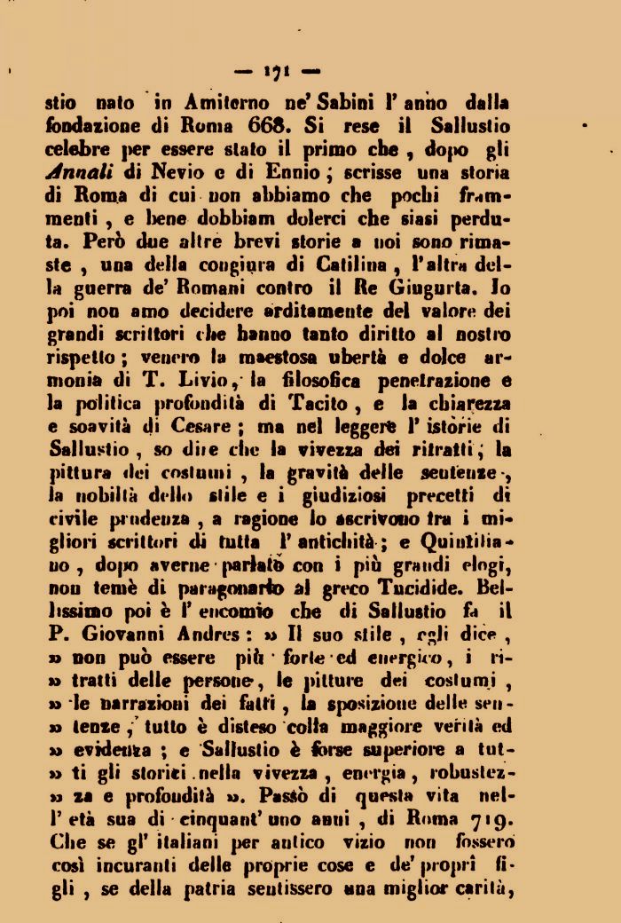 stio nato in Amiterno ne' Sabini 1' anno dalla fondazione di Roma 668. Si rese il Sallustio celebre per essere stato il primo che , dopo gli Annali di Nevio e di Ennio ; scrisse una storia di Roma di cui non abbiamo che pochi frammenti , e bene dobbiam dolerci che siasi perduta. Però due altre brevi storie a noi sono rimaste , una della cougiura di Catilina , l'altra della guerra de' Romani contro il Re Giugurta. Io poi non amo decidere arditamente del valore dei grandi scrittori che hanno tanto diritto al nostro rispetto ; venero la maestosa ubertà e dolce ar-monia di T. Livio, la filosofica penetrazione e la politica profondità di Tacito , e la chiarezza e soavità di Cesare ; ma nel leggeri* V istòrie di Sallustio , so dite che la vivezza dei ritratti ; la pittura dei costumi , la gravità delle sentenze -, la nobiltà dello stile e i giudiziosi precetti di civile prudenza , a ragione lo ascrivono tra i migliori scrittori dì tutta l'antichità; e Quintiliano , dopo averne parlato con i più grandi elogi, non temè di paragonarlo al greco Tucidide. Bellissimo poi è I' encomio che di Sallustio fd il P. Giovanni Andrcs : » Il suo stile , egli dice , » non può essere più * forte ed energu-o, i 11-» tratti delle persone, le pitture dei costumi , » le narrazioni dei fatti , la sposizioue delle sensi lenze tutto è disteso colta maggiore verità ed » evidenza ; e Sallustio è forse superiore a tot-» ti gli storici nella vivezza, energia, robustez-» za e profondità ». Passò di questa vita nel-I' età sua di cinquant'uno anni , di Roma 719. Che se gì' italiani per autico vizio non fossero così incuranti delle proprie cose e de'propri figli , se della patria sentissero una miglior carità,
