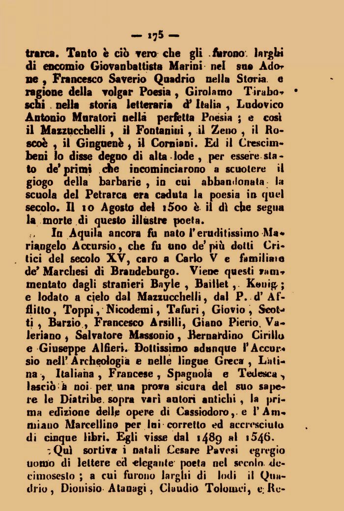 In Aquila ancora fu nato l'eruditissimo Ma* riangelo Accursio, che fu uno de1 più dotti Critici del secolo XV, caro a Carlo V e familiaie de' Marchesi di Braudeburgo. Viene questi yatn* mentato dagli stranieri Bayle , Baillet Kdtiif^ j e lodato a cielo dal Mazzucchelli, dal P. d' Afflitto, Toppi, Nicodemi, Tafuri, Giovio , Scot-* ti , Barzio , Francesco Arsilli, Giano Pierio. Va* le ria no i Salvatore Massonio , Bernardino Cirillo e Giuseppe Alfieri. Dottissimo adunque l'Accur* sio nell'Archeologia e nelle lingue Greca , Lati* na , Italiana , Francese , Spagnola e Tedesca •, lasciò li noi per una prova sicura del suo sape* re le Diatribe, sopra vari autori antichi , la prima edizione delle opere di Cassiodoro,. e l'Ani* miano Marcellino per Ini corretto ed accresciuta di cinque libri. Egli visse dal 1489 '1 >546.