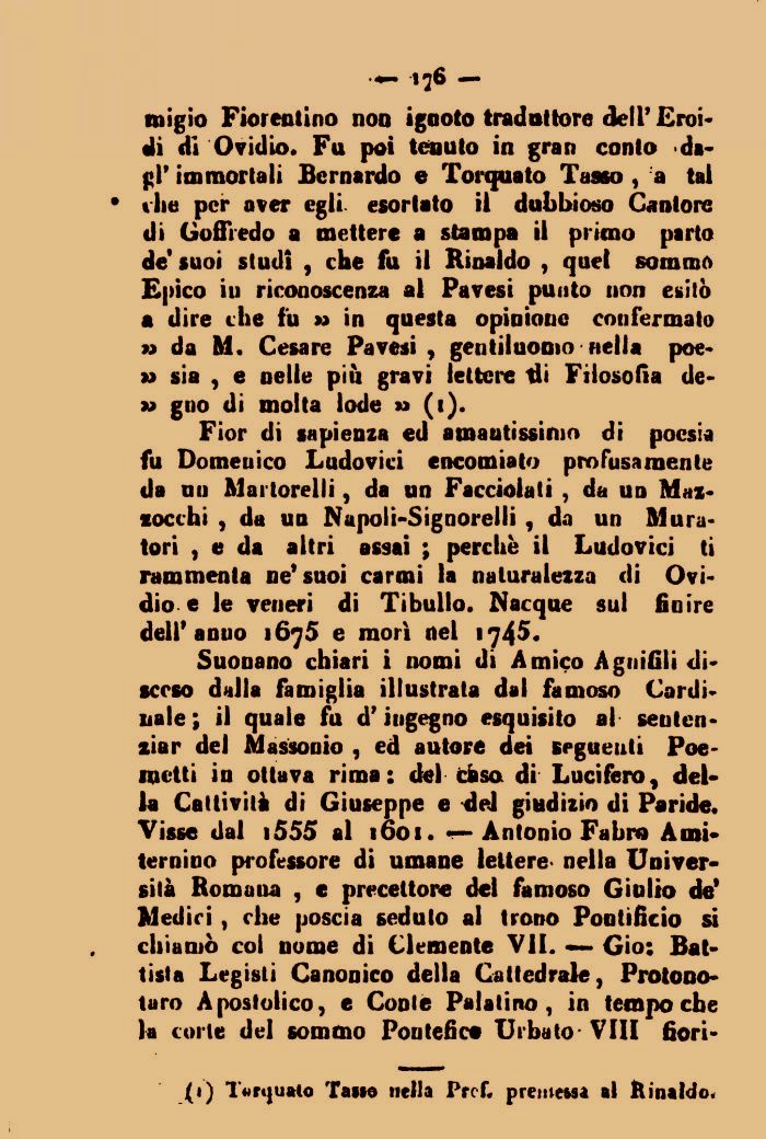 litigio Fiorentino non ignoto traduttore dell' Eroi* di di Ovidio* Fu poi tenuto in gran conto da* gì' immortali Bernardo e Torquato Tasso , a tal 9 the per aver egli, esortato il dubbioso Cantore di Goffredo a mettere a stampa il primo parto de' suoi studi , che fu il Rinaldo , quel somma Epico iu riconoscenza al Pavesi punto non esitò a dire the fu » in questa opinione confermato » da M. Cesare Pavesi , gentiluomo nella poe* sia , e nelle più gravi lettere tii Filosofia de-» gno di molta lode »> (i).