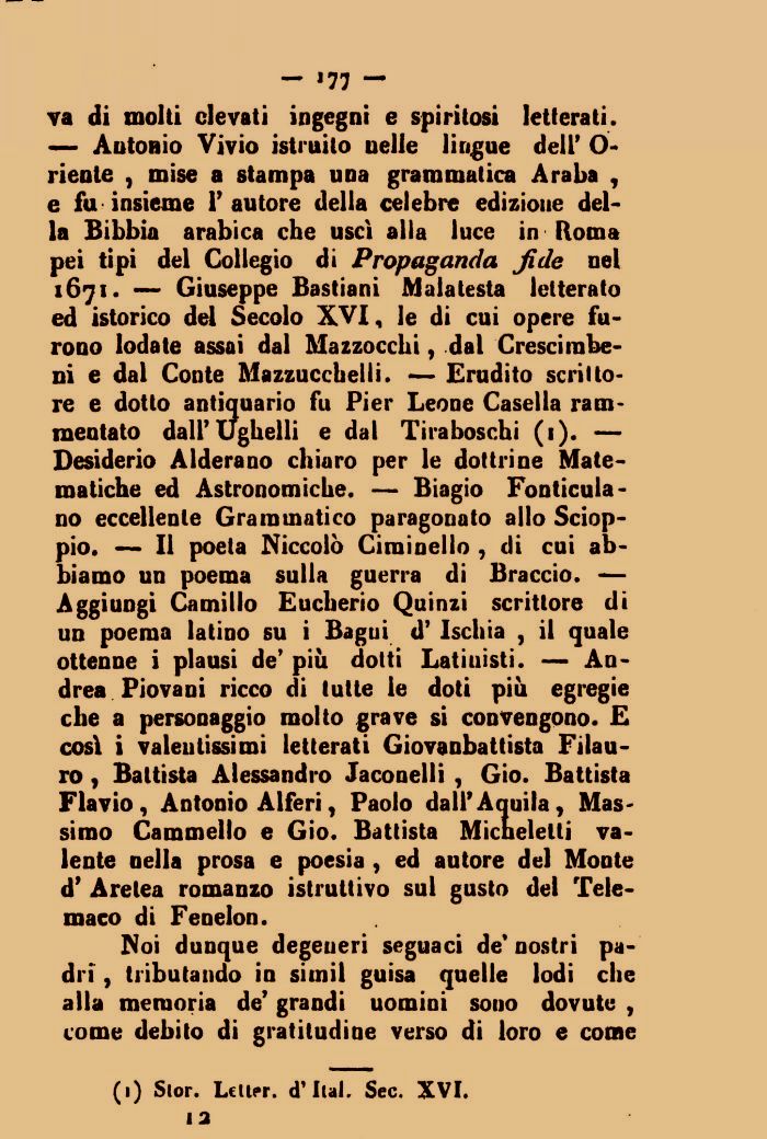 va di molti elevati ingegni e spiritosi letterati. — Antonio Vivio istruito nelle lingue dell' O-riente , mise a stampa una grammatica Araba , e fu insieme l'autore della celebre edizioue della Bibbia arabica che uscì alla luce in Roma pei tipi del Collegio di Propaganda fide nel 1671. — Giuseppe Bastiani Mala testa letterato ed istorico del Secolo XVI, le di cui opere furono lodate assai dal Mazzocchi, dal Crescirabe-ni e dal Conte Mazzucchelli. — Erudito scrittore e dotto antiquario fu Pier Leone Casella rammentato dall'Ughelli e dal Tiraboschi (1). — Desiderio Alderano chiaro per le dottrine Matematiche ed Astronomiche. — Biagio Fonticula-no eccellente Grammatico paragonato allo Sdoppio. — Il poeta Niccolò Cirainello , di cui abbiamo un poema sulla guerra di Braccio. — Aggiungi Camillo Euclierio Quinzi scrittore di un poema latino su i Bagui d' Ischia , il quale ottenne i plausi de' più dotti Latinisti. — Andrea Piovani ricco di tutte le doti più egregie che a personaggio molto grave si convengono. E così i valentissimi letterati Giovanbattista Filau-ro , Battista Alessandro Jaconelli , Gio. Battista Flavio, Antonio Alfieri, Paolo dall'Aquila, Massimo Cammello e Gio. Battista Michelelli valente nella prosa e poesia , ed autore del Monte d' Aretea romanzo istruttivo sul gusto del Telemaco di Fenelon.