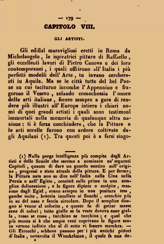 Gli edifizì maraviglisi eretti in Roma da Michelangelo , le ispiratrici pitture di Raffaello , gli eccellenti lavori di Pietro Canova e dei loro coutemporanei , i quali offrirono all' Italia i più perfetti modelli dell' Arte , tu invano cercheresti in Aquila. Ma se le città tutte del bel Paese su cui taciturno incombe l'Appennino e fragoroso il Vesevo , zelaudo comechessia l'onore delle arti italiane , fecero sempre a gara di rendere più illustri all' Europa intiera i chiari nomi di quei grandi artisti i quali sono testimoni immortali nella memoria dì qualunque altra nazione : ti è forza conchiudere, che la Pittura e le arti sorelle furono con ardore coltivate dagli Aquilani (i). Tra questi poi è a farsi singo-