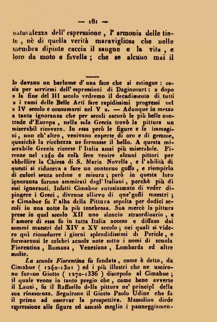 La scuola Fiorentina fu fondata, come è detto, da Cimabue ( ia4o-i3oi ) ed i più illustri che ne uscirò* no furono Giotto ( 1270-1336 ) discepolo al Cimabue; il quale venne in tanto pregio che , come bene avverte il Lauzi, fu il Raffaello d*lla pittura ne' principi della sua rinascenza. Seguirono il Giotto Paolo Udine che fu il primo ad osservar la prospettiva. IVI assolino diede eipressione alle figure ed assestò meglio i panneggia rnen-
