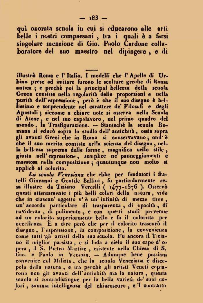qui onorala scuola in cui si educarono alle arti belle i nostri compaesani , tra i quali è a farsi singolare menzione di Gio. Paolo Cardone collaboratore del suo maestro nel dipingere , e di