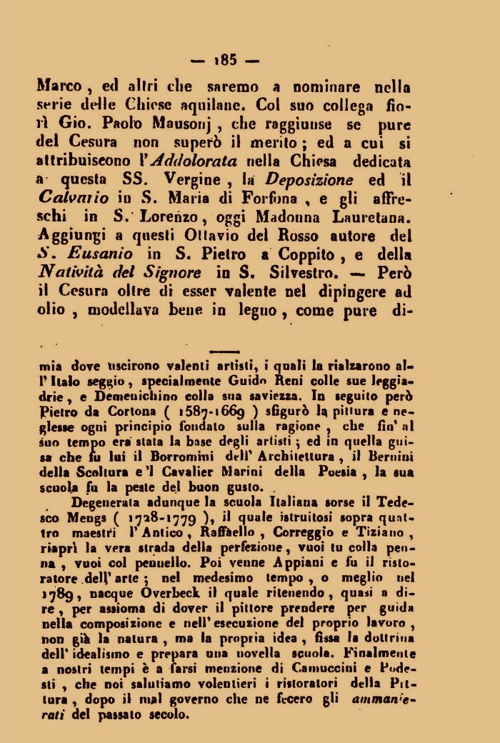 Marco , ed altri che saremo a nominare nella serie delle Chiese aquilane. Col suo collega fiorì Gio. Paolo Mausonj , che raggiuuse se pure del Cesura non superò il merito ; ed a cui si attribuiscono VAddolorata nella Chiesa dedicata a questa SS. Vergine , la Deposizione ed il Calvario in S. Maria di Forfona , e gli affreschi in S. Lorenzo, oggi Madonna Lauretana. Aggiungi a questi Ollavio del Rosso autore del S. Eusanio in S. Pietro a Coppito , e della Natività del Signore in S. Silvestro. — Però il Cesura oltre di esser valente nel dipingere ad olio , modellava bene in legno , come pure di-