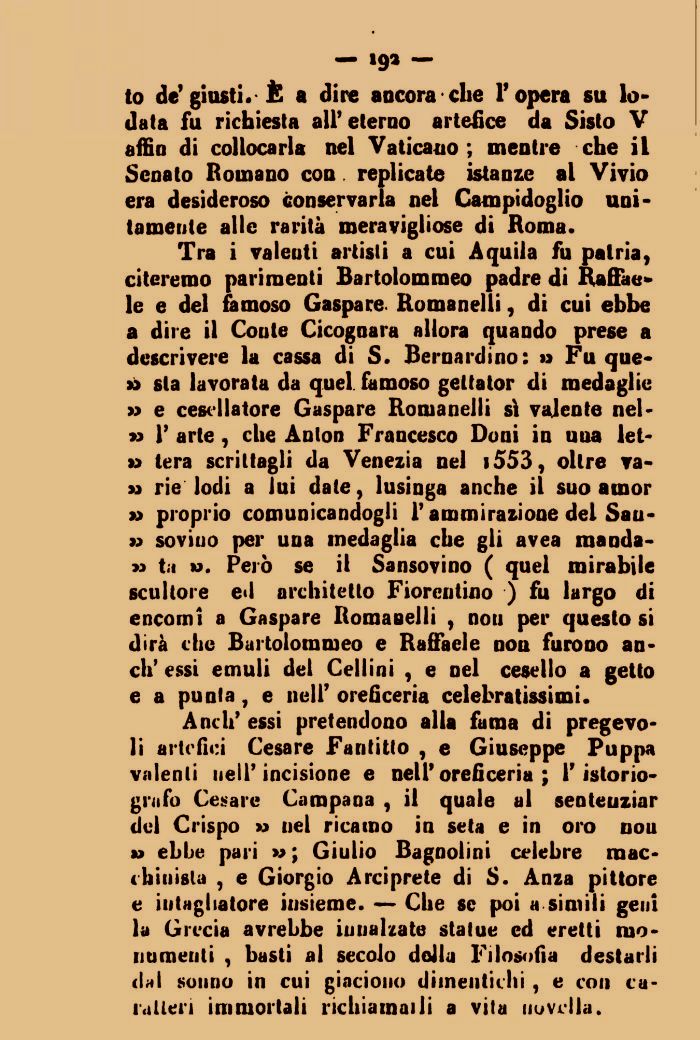 Tra i valenti artisti a cui Aquila fu patria, citeremo parimenti Bartolommeo padre di RafFae» le e del famoso Gaspare. Romanelli, di cui ebbe a dire il Conte Cicognara allora quando prese a descrivere la cassa di S. Bernardino: » Fu que-» sta lavorata da quel famoso gettator di medaglie » e cesellatore Gaspare Romanelli sì valente nel-» 1' arte , che Anton Francesco Doni in una let-» tera scrittagli da Venezia nel i553, oltre vaia rie lodi a lui date, lusinga anche il suo amor » proprio comunicandogli l'ammirazione del Sau-» soviuo per una medaglia che gli avea mandali t«< ». Però se il Sansovino ( quel mirabile scultore ed architetto Fiorentino ) fu largo di encomi a Gaspare Romanelli , non per questo si dirà che Bartolommeo e Raffaele non furono anch' essi emuli del Cellini , e nel cesello a getto e a punta, e nell' oreficeria celebratissimi.
