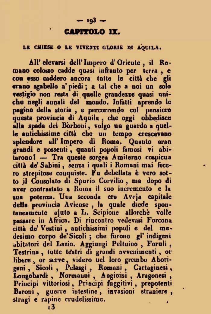 All'elevarsi dell'Impero d'Oriente, il Romano colosso cadde quasi infralito per terra , e con esso caddero ancora tulte le cittì che gli erano sgabello a' piedi ; a tal che a noi un 6olo vestigio noo resta di quelle grandezze quasi uniche negli aunali del mondo. Infatti aprendo le pagine della storia , e percorrendo col pensiero questa provincia di Aquila , che oggi obbedisce alla spada dei Borboni, volgo un guardo a quelle antichissime città che un tempo crescevano splendore all' Impero di Roma. Quanto eran grandi e possenti , quanti popoli famosi vi abitarono! — Tra queste sorgea Amiterno cospicua città de*Sabini, senza i quali i Romani mai fece* ro strepitose couquiste. Fu debellata è vero sotto jl Consolato di Spurio CorviIio , ma dopo di aver contrastato a Rotna il suo incremento e la sua potenza. Uua seconda era Aveja capitale della provincia Aviense , la quale diede spontaneamente ajuto a L. Scipione allorché volle passare in Africa. Di riucontro vedevasi Forcona città de' Vestiui , antichissimi popoli e del medesimo corpo de'Sicoli ; che furono gì' indigeni abitatori del Lazio. Aggiungi Peltuino , Foruli , Test ri na , tutte teatri di grandi avvenimenti , or libere v or serve, videro uel loro grembo Aborigeni , Sicoli , Pelasgi , Romani , Cartaginesi, Longobardi , Normanni , Angioini , Aragonesi , Principi vittoriosi, Principi fuggitivi, prepotenti Baroni , guerre intestine, invasioni straniere , stragi e rapine crudelissime. é