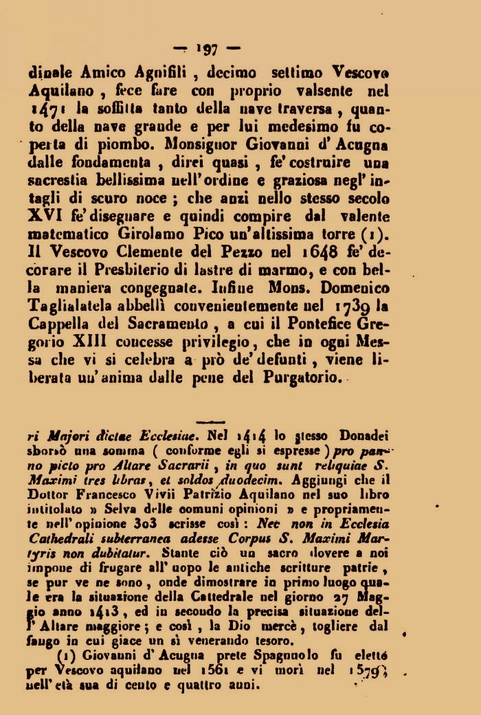 (1) Giovanni d'Acugna prete Spagnnolo fu eletté per Vescovo aquilano nel 1561 e vi morì nel 1 ^cf; . nell'eia sua di ceuto e quattro auni.