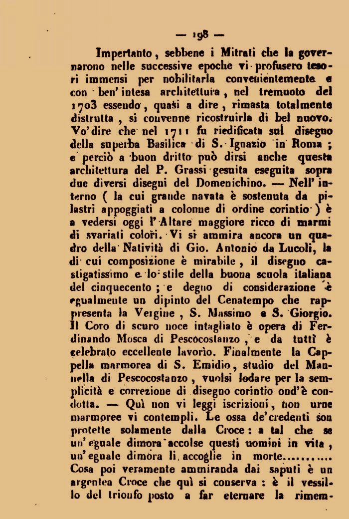 Imperiatilo, sebbene i Mitrati che la governarono nelle successive epoche vi profusero tesori immensi per nobilitarla convenientemente e con ben'intesa architettura, nel tremuoto del 1703 essendo , quafci a dire , rimasta totalmente distrutta , si convenne ricostruirla di bel nuovo. Vo'dire che nel 1711 fu riedificata sul disegno della superba Basilica di S. Ignazio in Roma ; e perciò a buon dritto può dirsi anche questa architettura del P. Grassi gesuita eseguita sopra due diversi disegni del Domenichino. —Nell'interno ( la cui graude navata è sostenuta da pilastri appoggiati a colonne di ordine corintio* ) è a vedersi oggi l'Altare maggiore ricco di marmi di svariati colori. Vi si ammira ancora un quadro della Natività di Gio. Antonio da Lucoli, la di cui composizione e mirabile , il disegno ca-stigatissimo e lo: stile della buona scuola italiana del cinquecento ; e degno di considerazione egualmente un dipinto del Cenatempo che rappresenta la Veigiue , S. Massimo a S. Giorgio. Il Coro di scuro noce intagliato è opera di Ferdinando Mosca di Pescòcostauzo , e da tutti è celebrato eccellente lavorìo. Finalmente la Cappella marmorea di S. Emidio, studio del Mannaia di Pescocostanzo , vuoisi lodare per la semplicità e correzione di disegno corintio ond'è condotta. — Qui uon vi leggi iscrizioni, non urne marmoree vi contempli. Le ossa de'credenti son protette solamente dalla Croce : a tal che se un'eguale dimoraaccolse questi uomini in vita ,