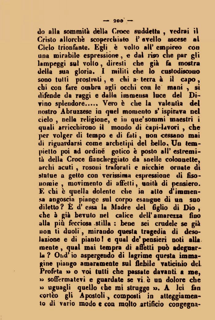 do alla sommità dèlia Croce suddetta , vedrai il Cristo allorché scoperchiato V avello ascese al Cielo trionfante. Egli è volto alt' empireo con una mirabile espressione, e dal riso che par gli lampeggi sul volto, diresti che già fa mostra della sua gloria. I militi che lo custodiscono sono tutti prostrati, e etti alena à il capo, chi con fare ombra agli occhi con le mani , si difende da raggi e dalia immensa luce del Divino splendore..... Vero è che la valentìa del nostro Abruzzese in quel momento s'ispirava nel cielo , nella religione, e in que'sommi maestri i quali arricchirono il mondo di capolavori , che per volger di tempo e di fati , non cessano mai di riguardarsi come archetipi del bello.. Un tempietto poi ad ordine gotico è posto all' estremità della Croce fiancheggiato da snelle colonnette, archi acuti , rosoni traforati e nicchie ornate di statue a getto con verissima espressione di fiso-noraie , movimento di affetti, unità di pensiero. E chi e quella dolente che in atto d'immensa angoscia piange sul corpo esaugue di un suo diletto? È d' essa la Madre del figlio di Dio , che à già bevuto nel calice dell'amarezza fino alla più fecciosa .stilla : bene sei crudele se già non ti duoli , mirando questa tragedia di desolazione e di pianto! e qual de9pensieri noti alla mente , qual mai tempra di affetti può adeguarla ? Ond' io aspergendo di lagrime questa immagine piango amaramente sul flebile vaticinio dei Profeta » o voi tutti che passate davanti a me, » soffermatevi e guardate se vi. è un dolore che ' uguagli quello (he mi strugge ». A lei fan cortèo gli Apostoli > composti in atteggiamento di vario modo e con mplto artificio congegna-