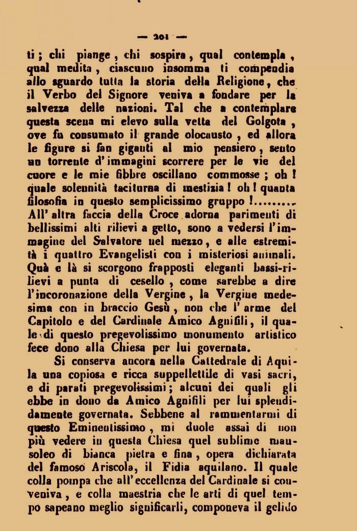 Si conserva ancora nella Cattedrale di Aquila una copiosa e ricca suppellettile di vasi sacri, e di parati pregevolissimi; alcuoi dei quali gli ebbe in dono da Amico Agnifili per lui splendidamente governata. Sebbene al rammentarmi di questo Emineutissimo , mi duole assai di non più vedere iu questa Chiesa quel sublime mausoleo di bianca pietra e fina , opera dichiarata del famoso A riscola, il Fidia aquilano. Il quale colla pompa che all'eccellenza del Cardinale si conveniva , e colla maestria che le arti di quel tempo sapeano meglio significarli, componeva il gelido