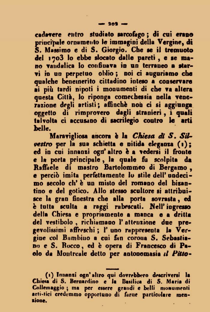Maravigliosa ancora fe la Chiesa di S. Silvestro per la sua schietta e nitida eleganza (t); ed in cui innanzi ogd' altro è a vedersi il fronte e la porta principale, la quale fu scolpita da Raffaele di mastro Bartolommeo di Bergamo , e perciò imita perfettamente lo stile dell' undeci-mo secolo eli9 è un misto del romano del bizantino e del gotico. Allo stesso scultore si attribuisce la gran finestra che alla porta sovrasta, ed è tutta sculta a raggi rabescati. Meli9 ingresso della Chiesa e propriamente a manca e a dritta del vestibolo , richiamano 1' attenzione due pregevolissimi affreschi ; 1' uno rappresenta la Vergine col Bambino a cui fan corona S. Sebastiano e S. Rocco, ed è opera di Francesco di Paolo da Moutreale detto per antonomasia */ Pitto-