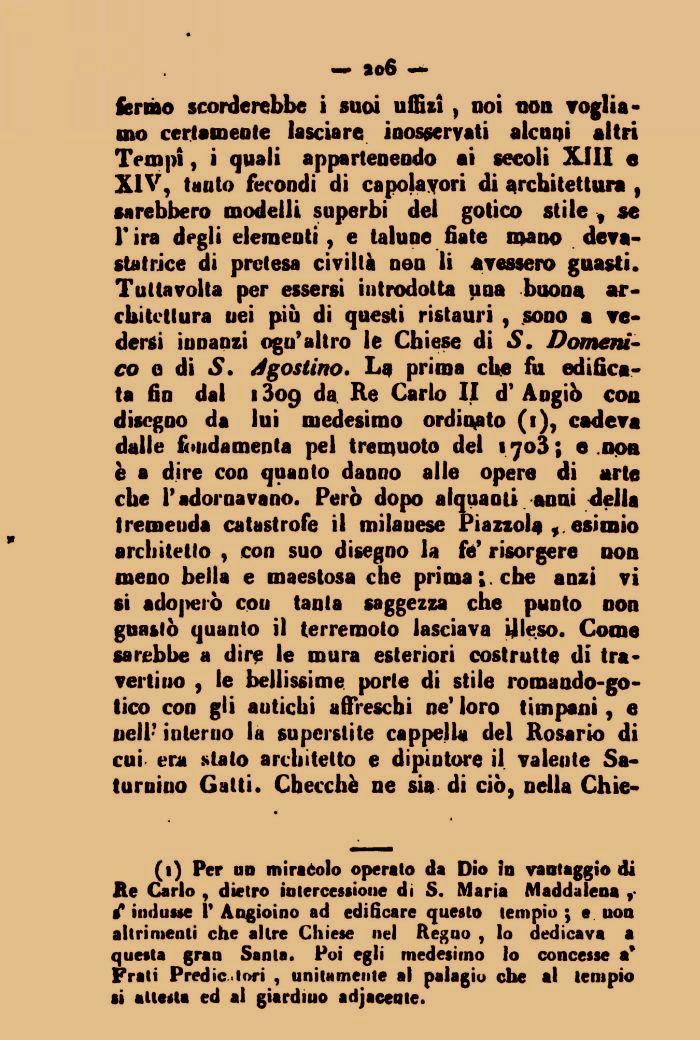 (1) Per nn minèolo operalo da Dio in vantaggio di Re Carlo , dietro intercessione di S. Maria Maddalena , f indusse 1' Angioino ad edificare questo tempio ; e uon altrimenti che altre Chiese nel Regno , lo dedicava a questa gran Santa. Poi egli medesimo lo concesse a* Frali Predicatori , unitamente al palagio che al tempio si attesta ed al giardiuo adjacenie.