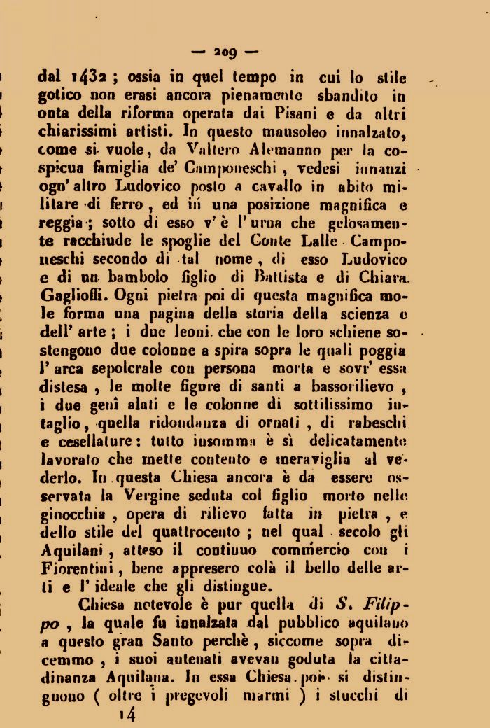 dai i43a ; ossia in quel tempo in cui lo stile gotico non erasi ancora pienamente sbandito in onta della riforma operata dai Pisani e da nitri chiarissimi artisti. In questo mausoleo innalzato, come si vuole, da Vallerò Alemanno per la co-spicua famiglia de' C;imponeschi , vedesi innanzi ogn' altro Ludovico posto a cavallo in abito militare di ferro , ed ili una posizione magnifica e reggia ; sotto di esso v' è l'urna che gelosamente racchiude le spoglie del Conte Lalle Camponeschi secondo di tal nome , di esso Ludovico e di un bambolo figlio di Battista e di Chiara. Gaglioffi. Ogni pietra poi di questa magnifica mole forma una pagina della storia della scienza e dell' arte ; i due leoni, che con le loro schiene sostengono due colonne a spira sopra le quali poggia 1' arca sepolcrale cou persona morta e sovr' essa distesa , le molte figure di santi a bassorilievo , i due geni alati e le colonne di sottilissimo iu«-taglio, quella ridondanza di ornati , di rabeschi e cesellature: tutto insomma è sì delicatamente lavorato che mette contento e meraviglia al vederlo. Iti.questa Chiesa ancora è da essere osservata la Vergine seduta col figlio morto nelle ginocchia , opera di rilievo fatta in pietra , e dello stile del quatlroceuto ; nel qual secolo gli Aquilani , atteso il continuo commercio cou i Fiorentini, bene appresero colà il bello delle arti e l'ideale che gli distingue.