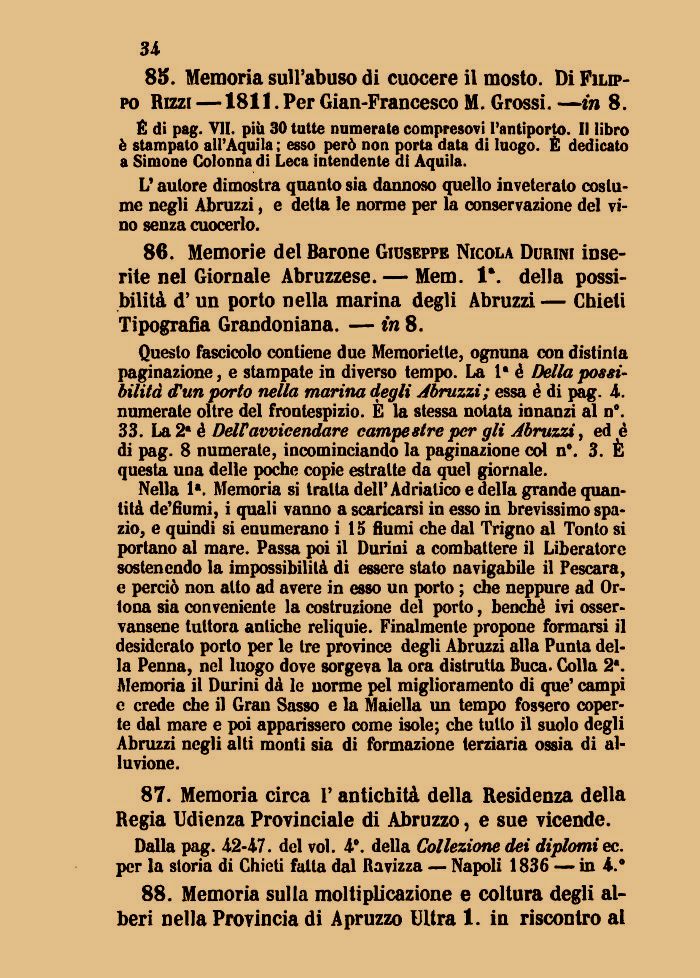 86. Memorie del Barone Giuseppe Nicola Durini inserite nel Giornale Abruzzese. — Mem. 1\ della possibilità d'un porto nella marina degli Abruzzi — Chieti Tipografìa Grandoniana. — in 8.