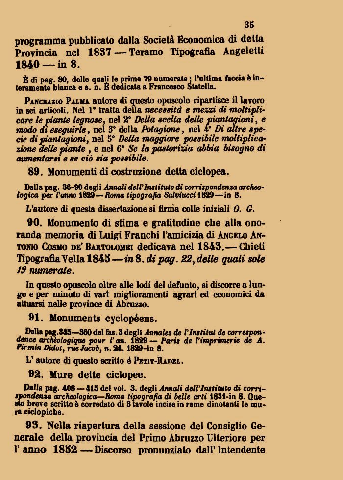 90. Monumento di stima e gratitudine che alla onoranda memoria di Luigi Franchi l'amicizia di Angelo Antonio Cosmo de'Bartolomei dedicava nel 1843.—Chieti Tipografia Velia 1845—in 8. di pag. 22 ^ delle quali sole 19 numerate.