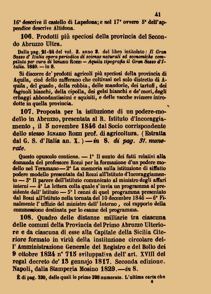 107. Proposta per la istituzione di un podere-modello in Abruzzo, presentata al R. Istituto d'Incoraggiamento , il 5 novembre 1846 dal Socio corrispondente dello stesso Ignazio Rozzi prof, di agricoltura. ( Estratta dal G. S. d'Italia an. X. )—in 8. di pag. 81. numerate.
