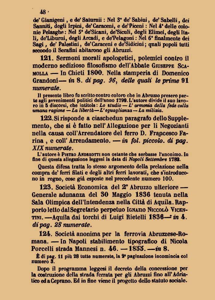 121. Sermoni morali apologetici, polemici contro il moderno sedizioso filosofismo dell'Abbate Giuseppe Sca-molla — In Chieti 1800. Nella stamperia di Domenico Grandoni— in 8. di pag. 96, delle quali le prime 91 numerate.