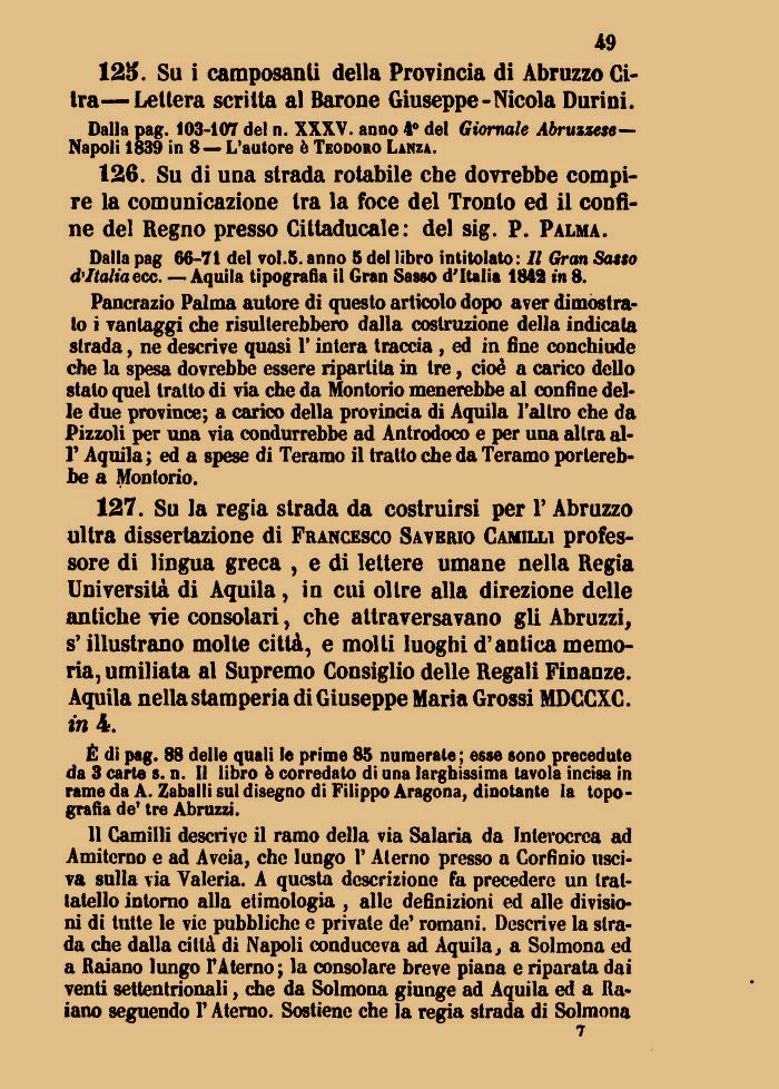 127. Su la regia strada da costruirsi per l'Abruzzo ultra dissertazione di Francesco Saverio Camilli professore di lingua greca , e di lettere umane nella Regia Università di Aquila, in cui olire alla direzione delle antiche vie consolari, che attraversavano gli Abruzzi, s'illustrano molte città, e molti luoghi d'antica memoria, umiliata al Supremo Consiglio delle Regali Finanze. Aquila nella stamperia di Giuseppe Maria Grossi MDCCXC. in 4.