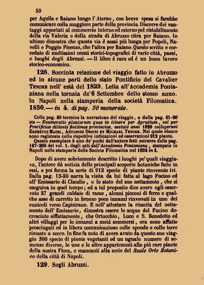128. Succinta relazione del viaggio fatto in Abruzzo ed in alcune parti dello stato Pontificio del Cavalier Tenore nell' està del 1829. Letta all'Accademia Ponta-niana nella tornala de'6 Settembre dello stesso anno. In Napoli nella stamperia della società Filoniatica. 1830.— in 4. di pag. 90 numerate.