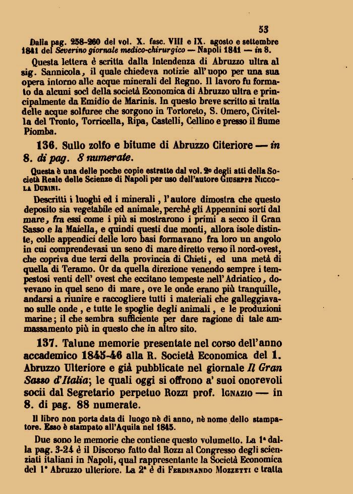 137. Talune memorie presentate nel corso deiranno accademico 1845-46 alla R. Società Economica del 1. Abruzzo Ulteriore e già pubblicate nel giornale II Gran Sasso cf Italia] le quali oggi si offrono a' suoi onorevoli sodi dal Segretario perpetuo Rozzi prof. Ignazio — in 8. di pag. 88 numerate.
