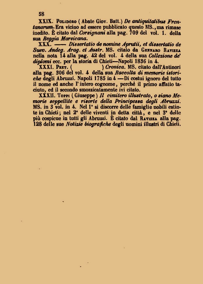 XXXI. Pret. ( ) Cronica. MS. citato dairAntinori alla pag. 306 del voi. 4 della sua Raccolta di memorie istori-che degli Abruzzi. Napoli 1785 in 4 —Di costui ignoro del tutto il nome ed anche V intero cognome, perché il primo affatto taciuto, ed il secondo smozzicatamente ivi citato.