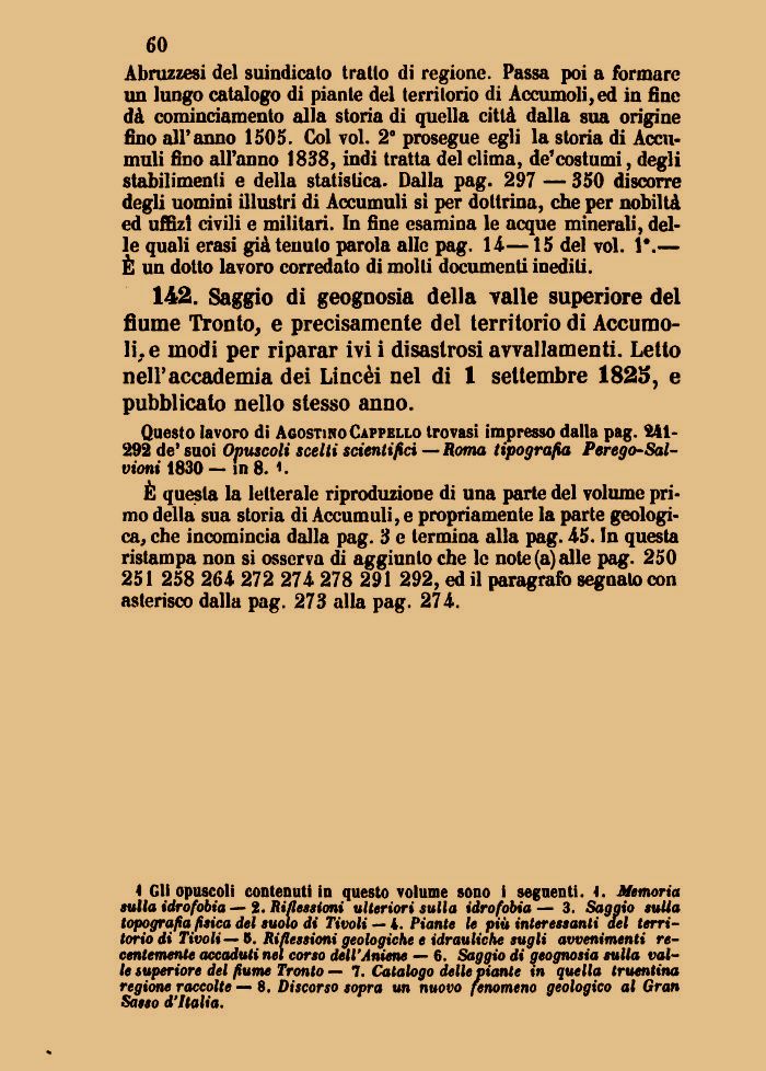 142. Saggio di geognosia della valle superiore del fiume Tronto, e precisamente del territorio di Accumo-li, e modi per riparar ivi i disastrosi avvallamenti. Letto nell'accademia dei Lincèi nel di 1 settembre 1825, e pubblicato nello stesso anno.