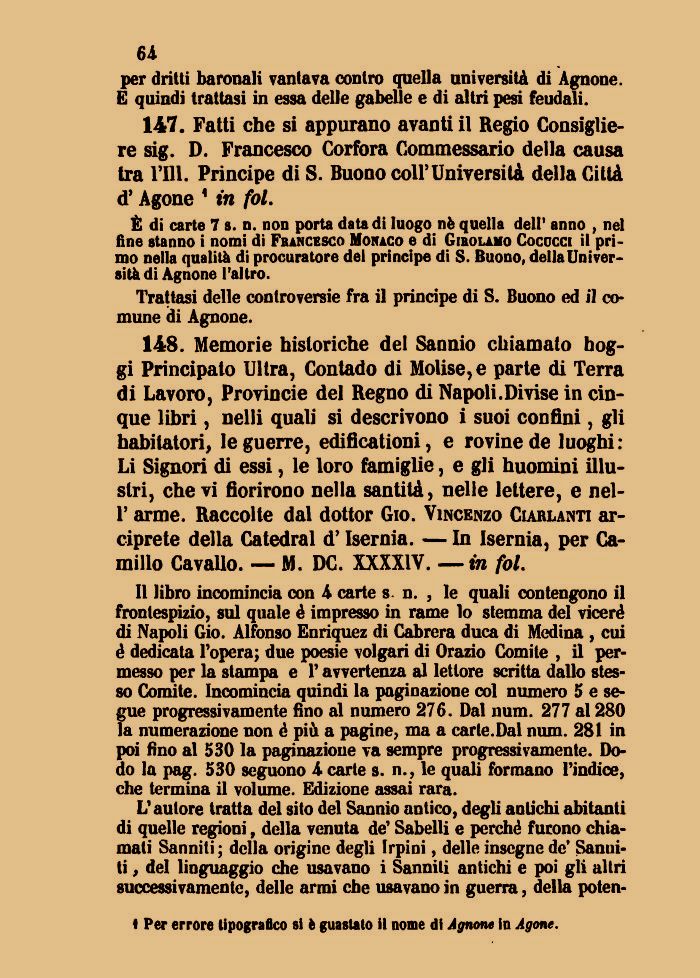 14S. Memorie hisloriche del Sannio chiamato bog-gi Principato Ultra, Contado di Molise, e parte di Terra di Lavoro, Provincie del Regno di Napoli.Divise in cinque libri, nelli quali si descrivono i suoi confini, gli habitatori, le guerre, edificationi, e rovine de luoghi: Li Signori di essi, le loro famiglie, e gli huomini illustri, che vi fiorirono nella santità, nelle lettere, e nel-1' arme. Raccolte dal dottor Gio. Vincenzo Ciarlanti arciprete della Catedral d'Isernia. — In Isernia, per Camillo CavaUo. — M. DC. XXXXIV. — in fot.