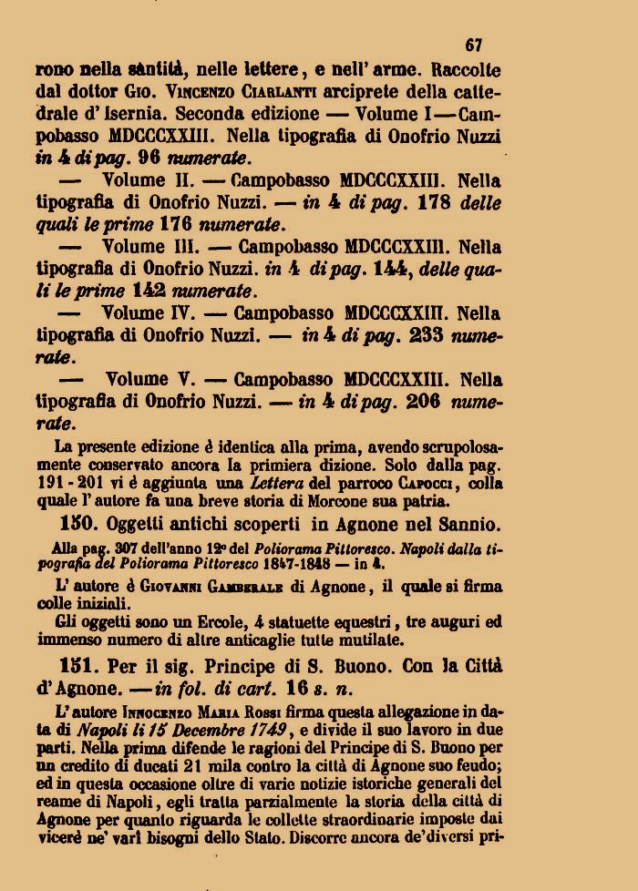 rono nella sàntità, nelle lettere, e neir arme. Raccolte dal dottor Gio. Vincenzo Ciarlanti arciprete della cattedrale d'Isernia. Seconda edizione — Volume I—Campobasso MDCCCXXIII. Nella tipografìa di Onofrio Nuzzi in 4 di pag. 96 numerate.