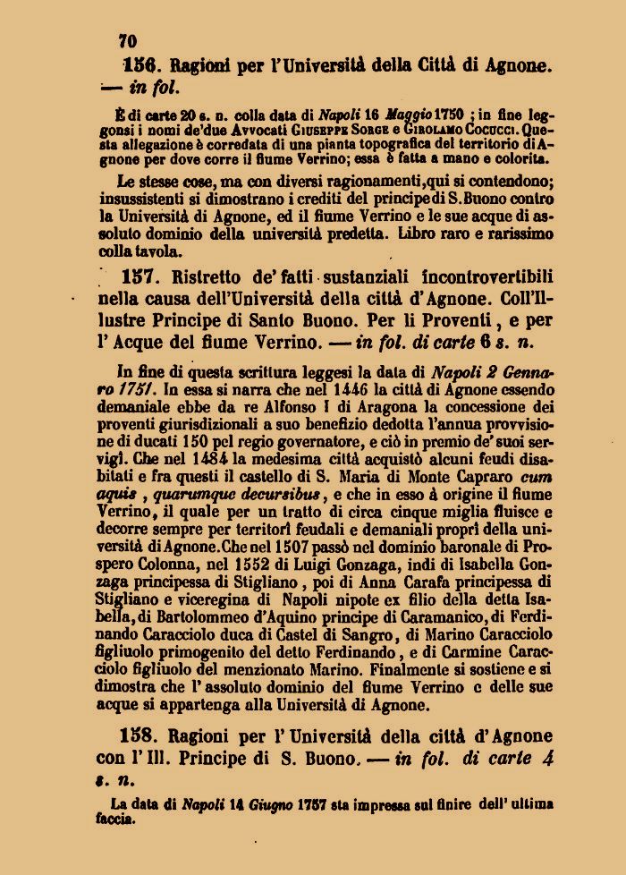 In fine di questa scrittura leggesi la data di Napoli 2 Gennaro 17SI. In essa si narra che nel 14-4-6 la città di Agnone essendo demaniale ebbe da re Alfonso I di Aragona la concessione dei proventi giurisdizionali a suo benefizio dedotta l'annua provvisione di ducati 150 pel regio governatore, e ciò in premio de' suoi servigi. Che nel 1484- la medesima città acquistò alcuni feudi disabitati e fra questi il castello di S. Maria di Monte Capraro cum aquis , quarumquc decursibus, e che in esso à origine il fiume Verrino, il quale per un tratto di circa cinque miglia fluisce e decorre sempre per territori feudali e demaniali propri della università di Agnone.Che nel 1507 passò nel dominio baronale di Prospero Colonna, nel 1552 di Luigi Gonzaga, indi di Isabella Gonzaga principessa di Stigliano , poi di Anna Carafa principessa di Stigliano e viceregina di Napoli nipote ex filio della detta Isabella, di Bartolommeo d'Aquino principe di Caramanico, di Ferdinando Caracciolo duca di Castel di Sangro, di Marino Caracciolo figliuolo primogenito del detto Ferdinando, e di Carmine Caracciolo figliuolo del menzionato Marino. Finalmente si sostiene e si dimostra che l'assoluto dominio del fiume Verrino e delle sue acque si appartenga alla Università di Agnone.