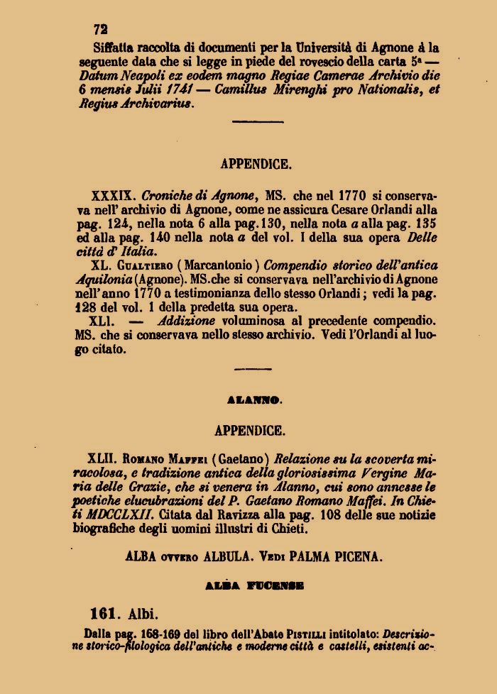 XL. Gualtiero ( Marcantonio ) Compendio storico delVantica Aguilonia (Agnone). MS.che si conservava nell'archivio di Agnone nell'anno 1770 a testimonianza dello stesso Orlandi ; vedi la pag. 128 del voi. 1 della predelta sua opera.