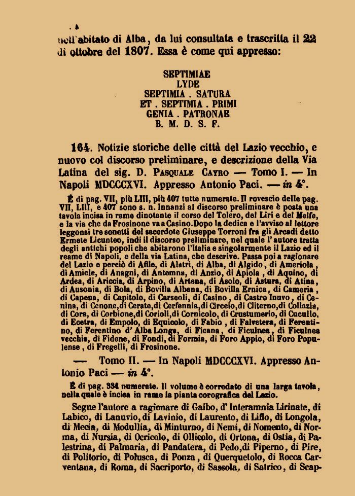 164. Notizie storiche delle città del Lazio vecchio, e nuovo col discorso preliminare, e descrizione della Via Latina del sig. D. Pasquale Cayro — Tomo I. — In Napoli MDCCCXVI. Appresso Antonio Paci. —in 4°.
