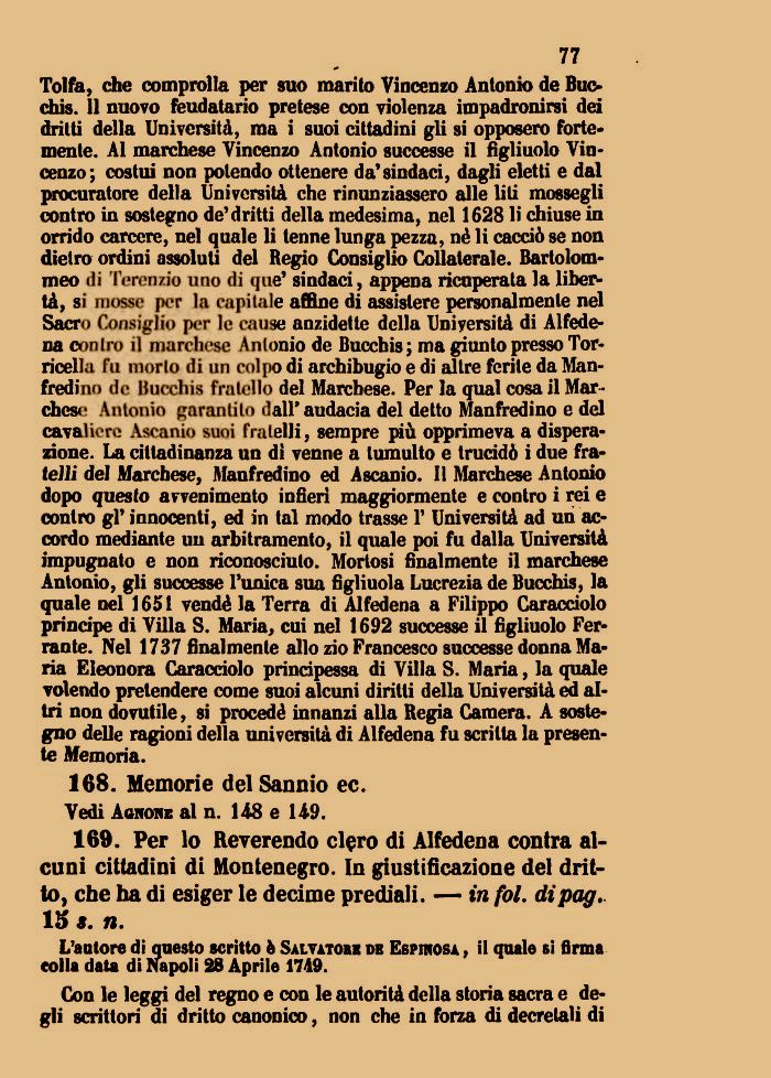 Tolfa, che comprolla per suo marito Vincenzo Antonio de Bue-chis. 11 nuovo feudatario pretese con violenza impadronirsi dei dritti della Università, ma i suoi cittadini gli si opposero fortemente. Al marchese Vincenzo Antonio successe il figliuolo Vincenzo; costui non polendo ottenere da'sindaci, dagli eletti e dal procuratore della Università che rinunziassero alle liti mossegli contro in sostegno de'dritti della medesima, nel 1628 li chiuse in orrido carcere, nel quale li tenne lunga pezza, né li cacciò se non dietro ordini assoluti del Regio Consiglio Collaterale. Bartolom-meo di Terenzio uno di que' sindaci, appena ricuperata la libertà, si mosse por la capitale affine di assistere personalmente nel Sacro Consiglio per le cause anzidette della Università di Alfede-na conln> il marchese Antonio de Bucchis; ma giunto presso Torricelli Fu morto tìi un colpo di archibugio e di altre ferite da Man-fredino de liuechis fratello del Marchese. Per la qual cosa il Mar-diesi1 Antonio garantito dall' audacia del detto Manfredino e del cavai io re Ascanio suoi fratelli, sempre più opprimeva a disperazione. La cittadinanza un di venne a tumulto e trucidò i due fratelli del Marchese, Manfredino ed Ascanio. Il Marchese Antonio dopo questo avvenimento infierì maggiormente e contro i rei e contro gì' innocenti, ed in tal modo trasse 1' Università ad un accordo mediante un arbitramento, il quale poi fu dalla Università impugnato e non riconosciuto. Mortosi finalmente il marchese Antonio, gli successe l'unica sua figliuola Lucrezia de Bucchis, la quale nel 1651 vendè la Terra di Alfedena a Filippo Caracciolo principe di Villa S. Maria, cui nel 1692 successe il figliuolo Ferrante. Nel 1737 finalmente allo zio Francesco successe donna Maria Eleonora Caracciolo principessa di Villa S. Maria, la quale volendo pretendere come suoi alcuni diritti della Università ed altri non dovutile, si procedé innanzi alla Regia Camera. A sostegno delle ragioni della università di Alfedena fu scritta la presente Memoria.