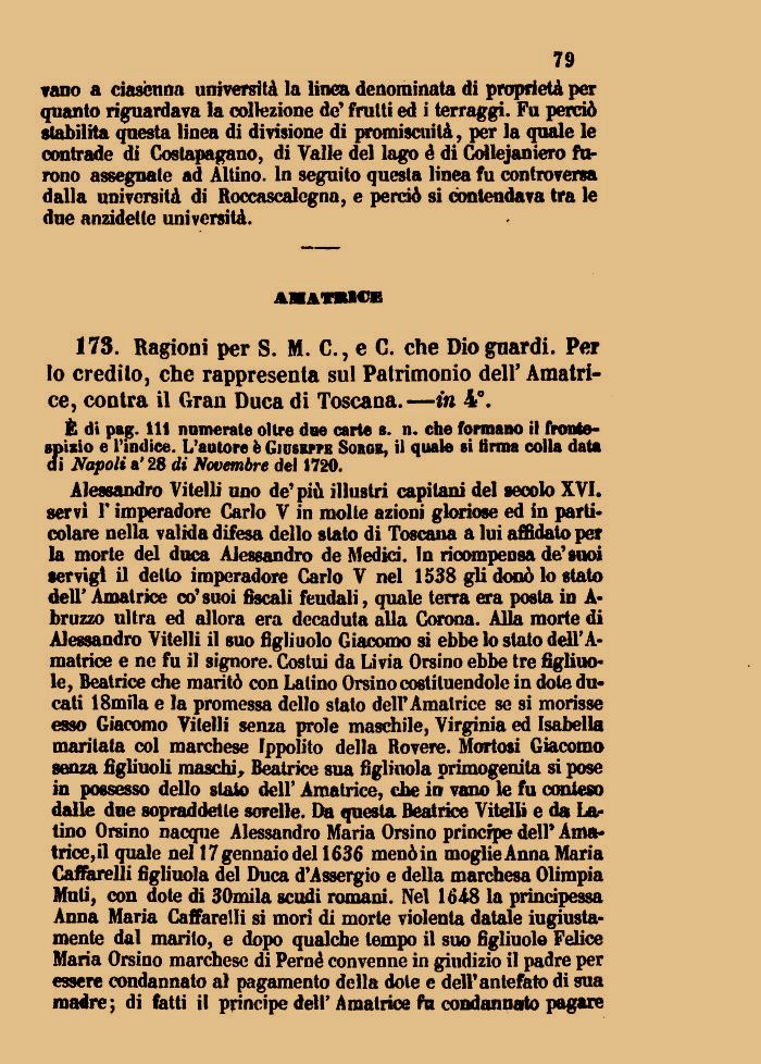 Alessandro Vitelli uno de' più illustri capitani del secolo XVI. servì I* imperadore Carlo V in molle azioni gloriose ed in particolare nella valida difesa dello stato di Toscana a lui affidato per la morte del duca Alessandro de Medici. In ricompensa de'suoi servigi il dello imperadore Carlo V nel 1538 gli donò lo stato dell' Amalrice co'suoi fiscali feudali, quale terra era posta in A-bruzzo ultra ed allora era decaduta alla Corona. Alla morte di Alessandro Vitelli il suo figliuolo Giacomo si ebbe lo stato dell'A-matrice e ne fu il signore. Costui da Livia Orsino ebbe tre figliuole, Beatrice che maritò con Latino Orsino costituendole in dote ducati 18mila e la promessa dello stato dell'Amalrice se si morisse esso Giacomo Vitelli senza prole maschile, Virginia ed Isabella maritata col marchese Ippolito della Rovere. Mortosi Giacomo senza figliuoli maschi, Beatrice sua figliuola primogenita si pose in possesso dello stato dell' Amatrice, che in vano le fu conleso dalle due sopraddette sorelle. Da questa Beatrice Vitelli e da Latino Orsino nacque Alessandro Maria Orsino principe dell* Amatrice, il quale nel 17 gennaio del 1636 menò in moglie Anna Maria CaffareJli figliuola del Duca d'Assergio e della marchesa Olimpia Muti, con dote di 30mila scudi romani. Nel 1648 la principessa Anna Maria Caffarelli si mori di morte violenta datale iugiusta-mente dal marito, e dopo qualche tempo il suo figliuole Felice Maria Orsino marchese di Perné convenne in giudizio il padre per essere condannato al pagamento della dote e dell'ante fato di sua madre; di fatti il principe dell'Amatrice fu condannato pagaie