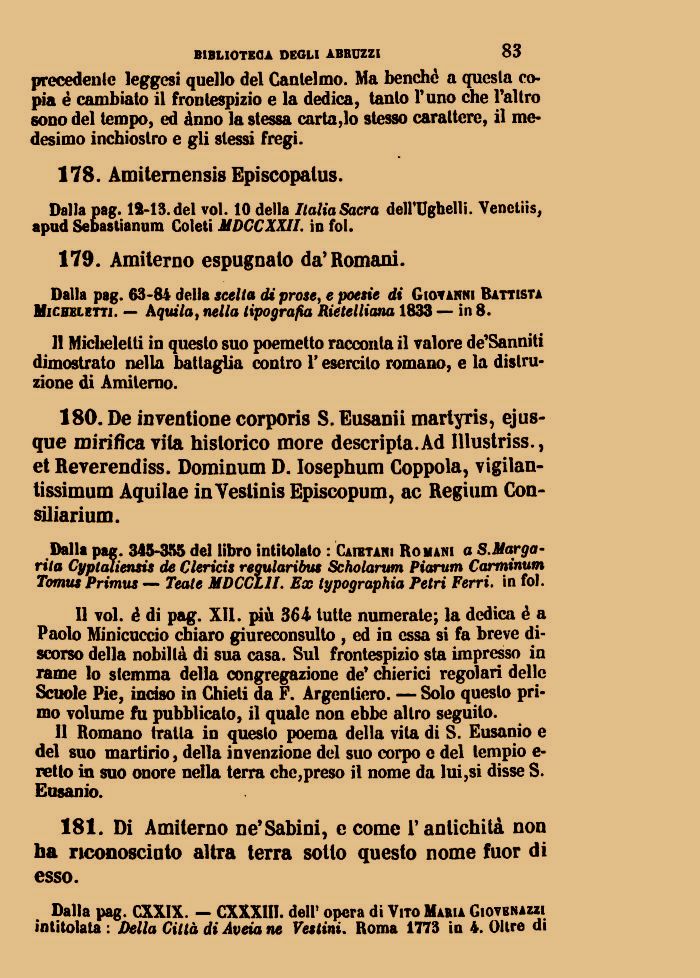 181. Di Amiterno ne'Sabini, e come l'antichità non ha riconosciuto altra terra sotto questo nome fuor di esso.