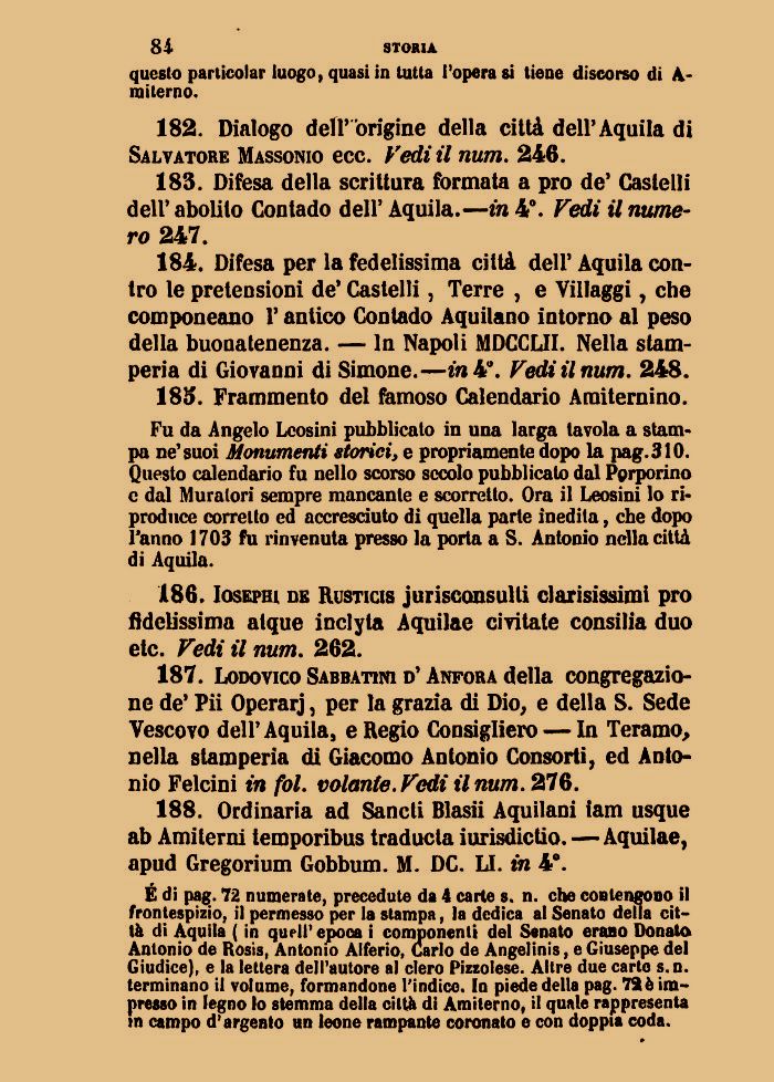 188. Ordinaria ad Sancti Blasii Aquilani iam usque ab Amiterni temporibus traducla iurisdictio.—Aquilae, apud Gregorium Gobbum. M. DC. LI. in 4°.
