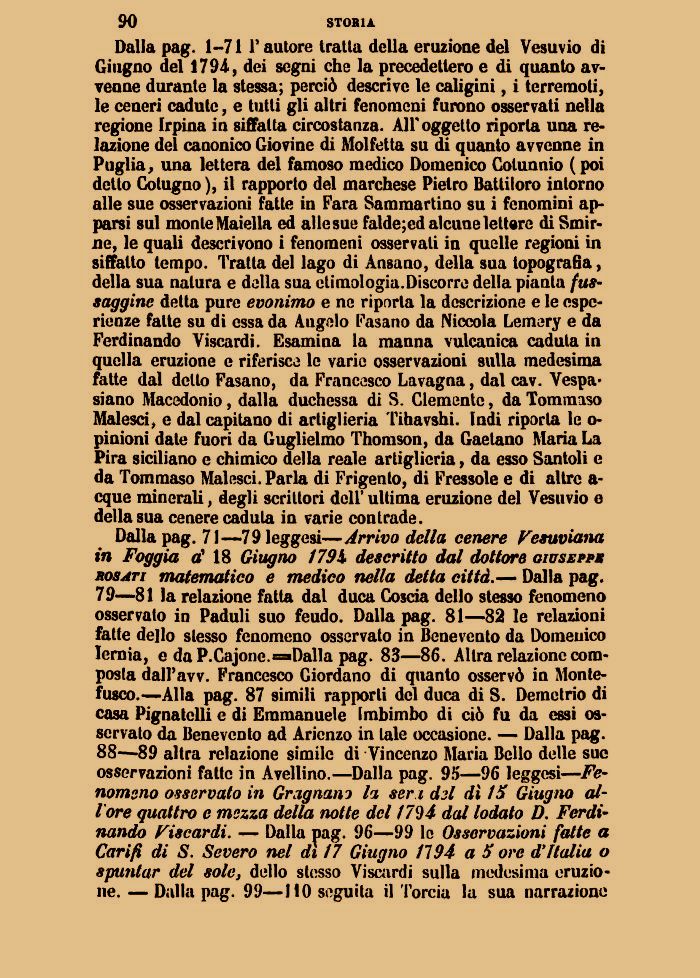 Dalla pag. 71—79 leggesi—Arrivo della cenere Vesuviana in Foggia a' 18 Giugno 179X descritto dal dottore oiusepps rosati matematico e medico nella detta città.— Dalla pag. 79—81 la relazione fatta dal duca Coscia dello stesso fenomeno osservato in Paduli suo feudo. Dalla pag. 81—82 le relazioni fatte dello stesso fenomeno osservato in Benevento da Domenico Iernia, e da P.Cajone.=»Dalla pag. 83—86. Altra relazione composta dall'avv. Francesco Giordano di quanto osservò in Monte-fusco.—Alla pag. 87 simili rapporti del duca di S. Demetrio di casa Pignatclli e di Emmanuele Imbimbo di ciò fu da essi osservato da Benevento ad Aricnzo in tale occasione. — Dalla pag. 88—89 altra relazione simile di Vincenzo Maria Bello delle sue osservazioni fatte in Avellino.—Dalla pag. 95—96 leggesi—Fenomeno osservato in Gragnani la ser i d3l dì 15 Giugno all'ore quattro e mezza della notte del 1794 dal lodato D. Ferdinando Viscardi. — Dalla pag. 96—99 le Osservazioni fatte a Carifi di S. Severo nel dì 17 Giugno 1194 a 5 ore d'Italia o spuntar del sole, dello stosso Viscardi sulla medesima eruzione. — Dalla pag. 99—110 seguila il Torcia la sua narrazione