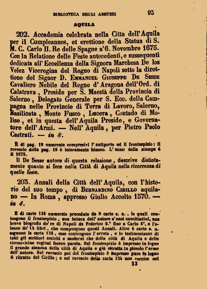202. Accademia celebrata nella Citta dell'Aquila per il Cumpleannos, et erettione della Statua di S. M. C. Carlo II. Re delle Spagne a'6. Novembre 1675. Con la Relatione delle Feste antecedenti, e sussequenti dedicata all' Eccellenza della Signora Marchesa De los Velez Viceregina del Regno di Napoli sotto la diret-tione del Signor D. Emmanuel Giuseppe De Sesse Gavaliero Nobile del Regno d'Aragona dell'Ord. di Calatrava , Preside per S. Maestà della Provincia di Salerno, Delegato Generale per S. Ecc. della Campagna nelle Provincie di Terra di Lavoro, Salerno, Basilicata , Monte Fusco , Lucerà, Contado di Molise, et in questa dell'Aquila Preside, e Governatore dell' Armi. — Neil' Aquila, per Pietro Paolo Castrati. — in 8.