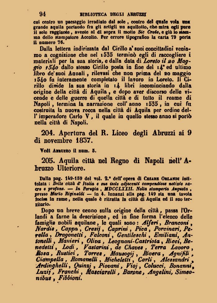 Dopo nn breve cenno sulla origine della città, passa l'Orlandi a farne la descrizione, ed in fine forma l'elenco delle famiglie nobili aquilane, le quali sono : Al/eri, Bronconi, JVardis, Cappa , Cresi] , Caprini , Pica , Porcinari, Peretta , Dragonetli, Falconi, Gentileschi, Emiliani, An-tonelli, Manieri , Oliva , Leognani- Castriota s Rìcci, Benedetti , Lodi, Pastorini, de Chaves , Terra Lavoro , Rosa, Rustici , Torres, Mausogij , Rivera , Agni fi li , Ciafnpella , Romanelli, Micheletti, Carli, Alessandri % Ardinghelli, Quinzì , Piovani, Vioj, Colucci, Bonanni, Luzij, Franchi, Masciarelli, Barone, Angelini, Simeo-nibus, Fibbioni.