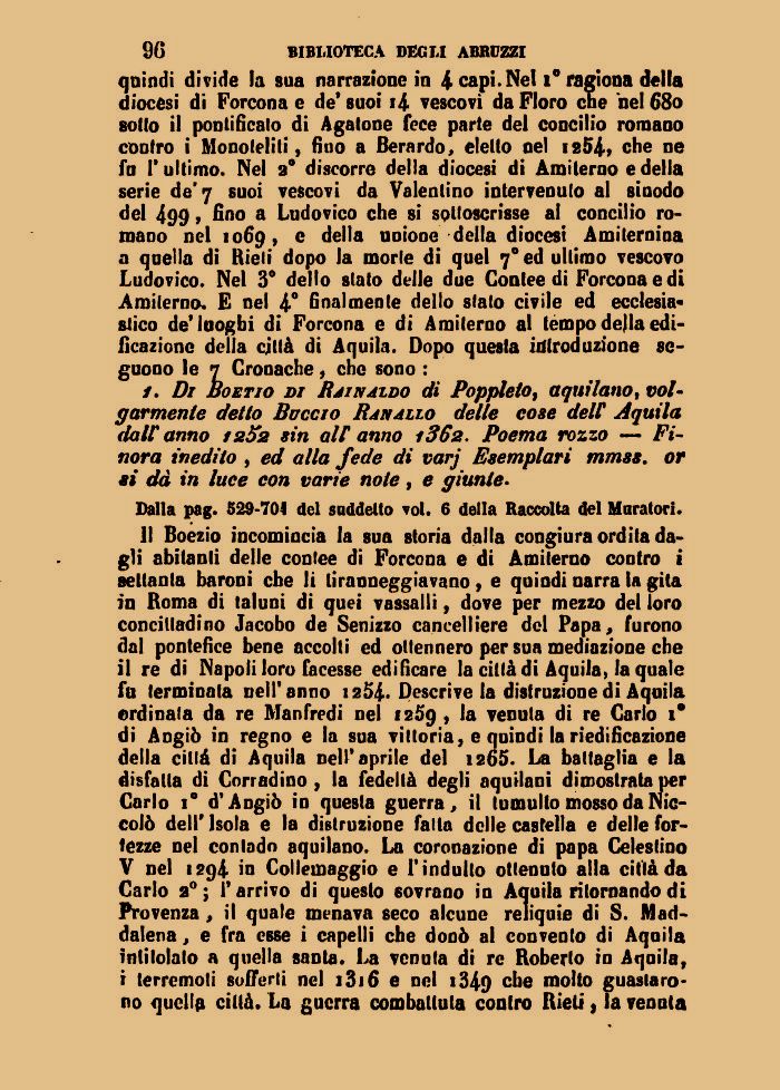Il Boezio incomincia la sua storia dalla congiura ordita dagli abitanti delle contee di Forcona e di Amiterno contro i settanta baroni che li tiranneggiavano, e quindi narra la gita in Roma di taluni di quei vassalli, dove per mezzo del loro concittadino Jacobo de Senizzo cancelliere del Papa, furono dal pontefice bene accolti ed ottennero per sua mediazione che il re di Napoli loro facesse edificare la città di Aquila, la quale fu terminata nell'anno 1254- Descrive la distruzione di Aquila ordinala da re Manfredi nel 1259 , la venuta di re Carlo i° di Angiò in regno e la sua vittoria, e quindi la riedificazione della citlà di Aquila nell'aprile del 1265. La battaglia e la disfatta di Corredino , la fedeltà degli aquilani dimostrata per Carlo i° d'Angiò in questa guerra, il tumulto mosso da Niccolò dell' Isola e la distruzione fatta delle castella e delle fortezze nel contado aquilano. La coronazione di papa Celestino V nel 1294 in Collemaggio e l'indulto ottenuto alla città da Carlo 2° ; l'arrivo di questo sovrano in Aquila ritornando di Provenza , il quale menava seco alcune reliquie di S. Maddalena , e fra esse i capelli che donò al convento di Aquila intitolalo a quella santa. La venuta di re Roberto io Aquila, i terremoti sofferti nel i3i6 e nel i349 c'ie mo'to guastarono quella città. La guerra combattuta contro Rieti, la venuta