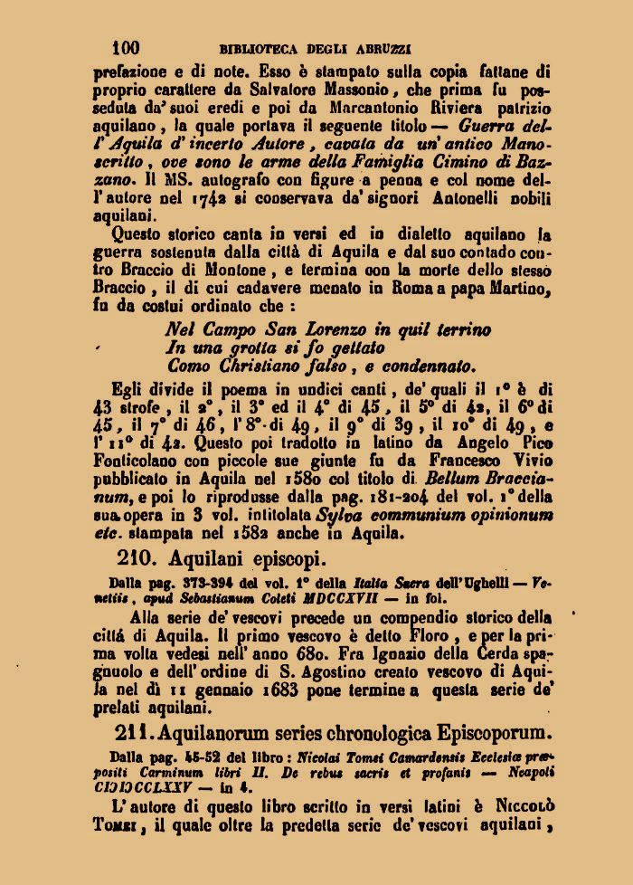 Questo storico canta io versi ed io dialetto aquilano la guerra sostenuta dalla città di Aquila e dal suo contado contro Braccio di Montone , e termina oon la morte dello stesso Braccio , il di cui cadavere menato in Roma a papa Martino, fu da costui ordinato che :